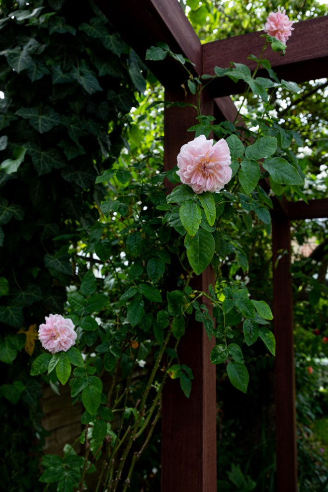 As well as roses, she planted three varieties of clematis on the pergola: C. ‘Frances Rivis’, C. viticella, and C. cirrhosa ‘Freckles’, which is winter-flowering. “[I included it] to make sure there was something you could see out of the picture window in the winter months,” Tracey says.