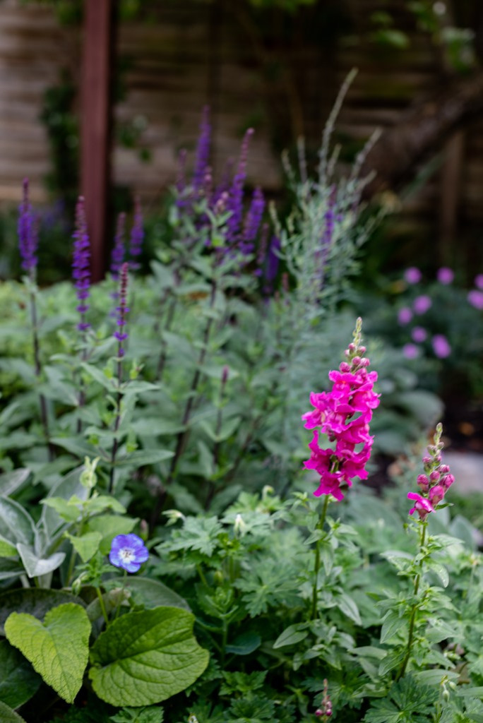 Salvia nemorosa ‘Caradonna’, pink Antirrhinum (snapdragon), and Geranium ‘Azure Rush’. “They’re easy to look after and are all long-flowering, which was important,” Tracey says.