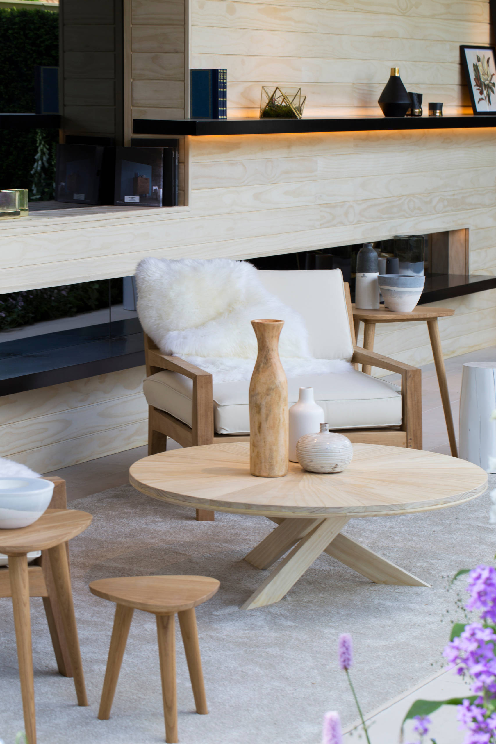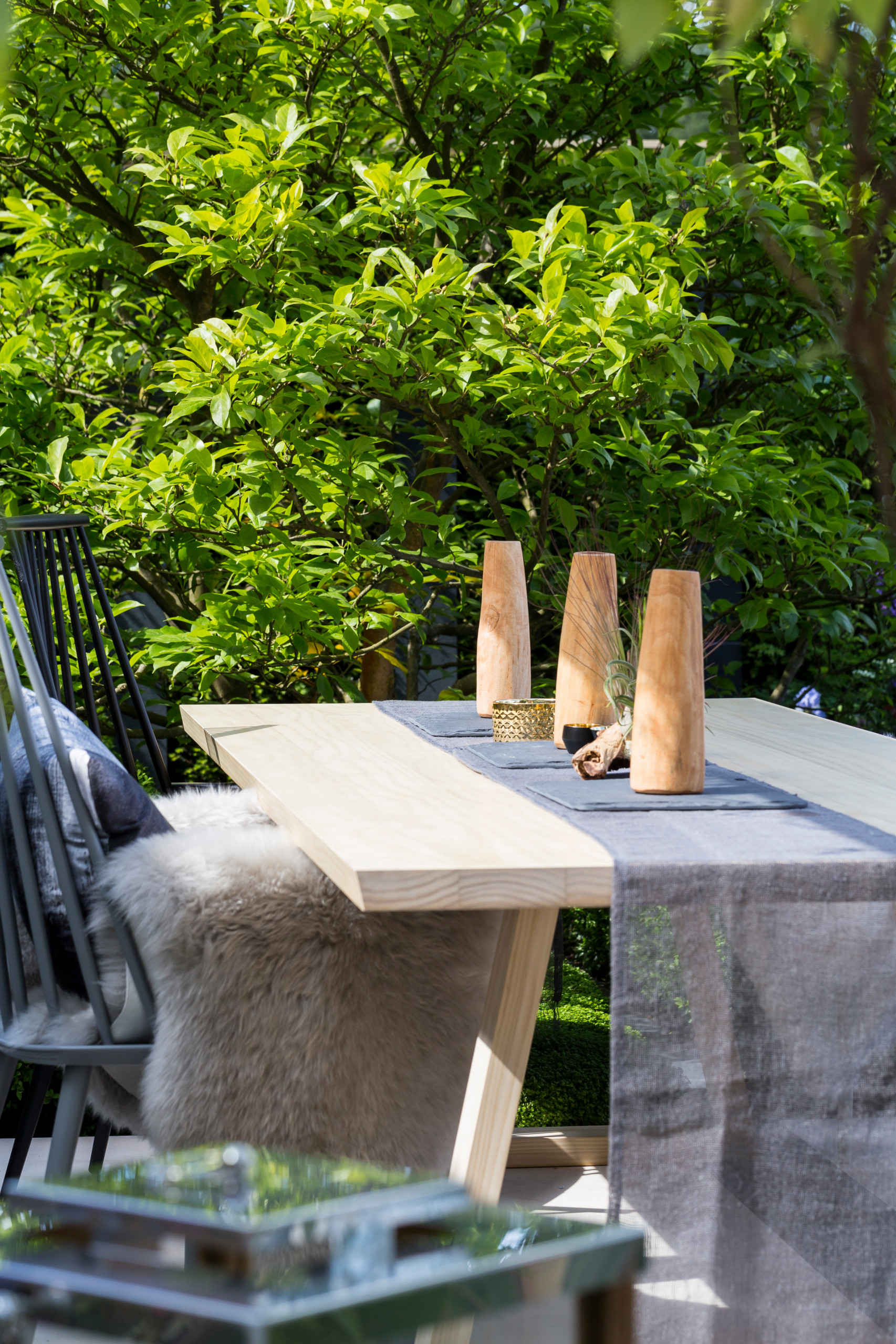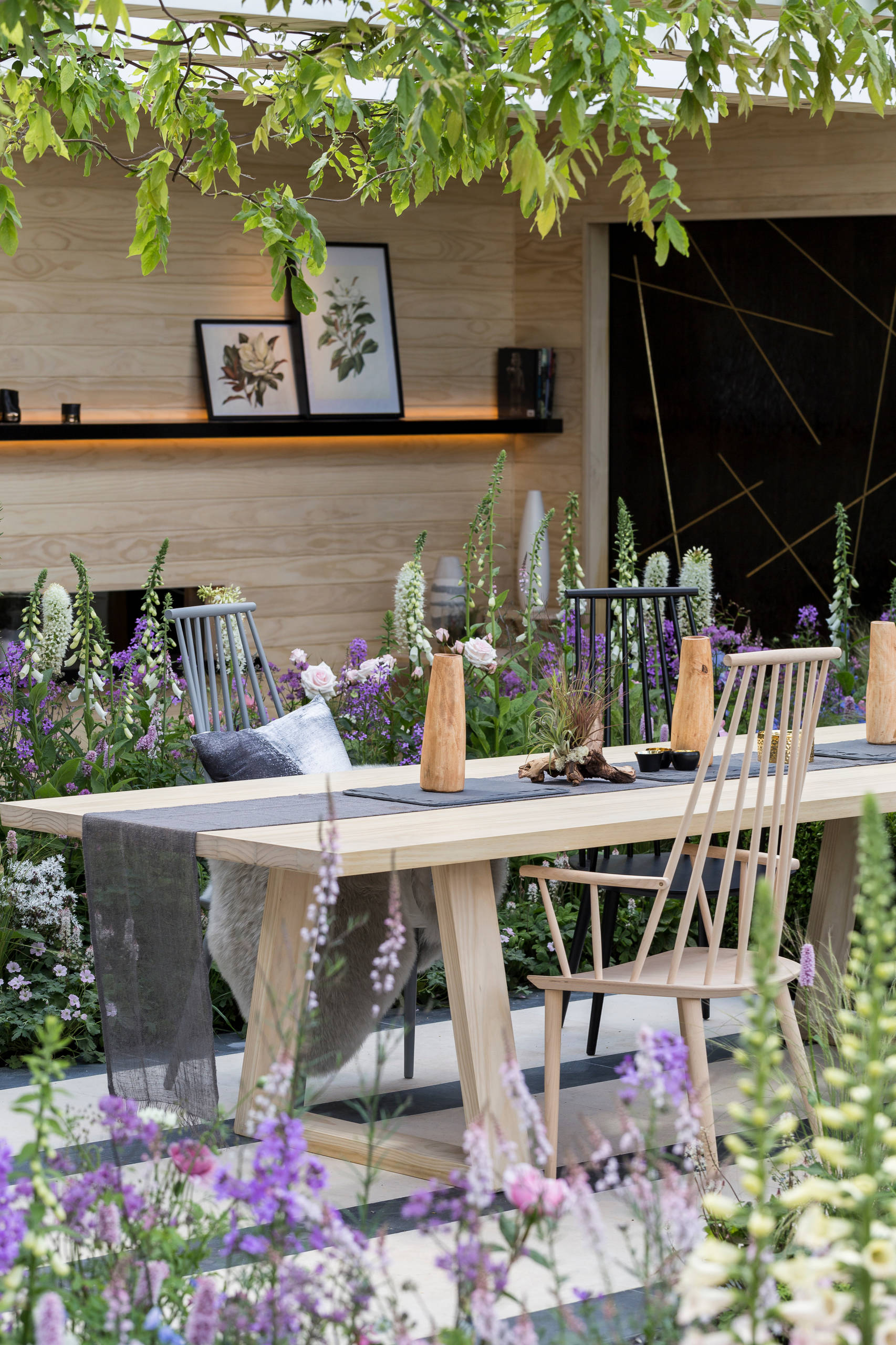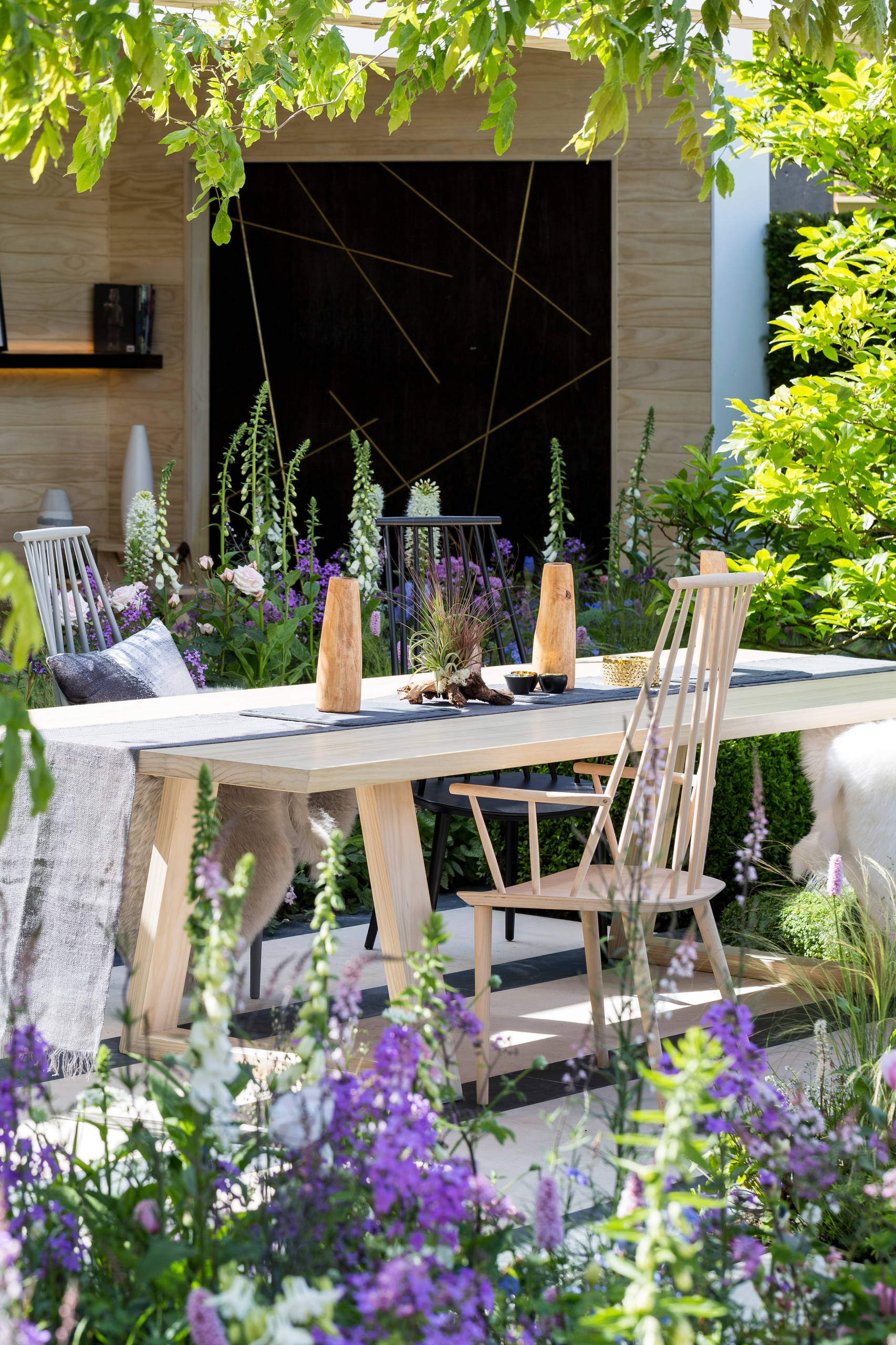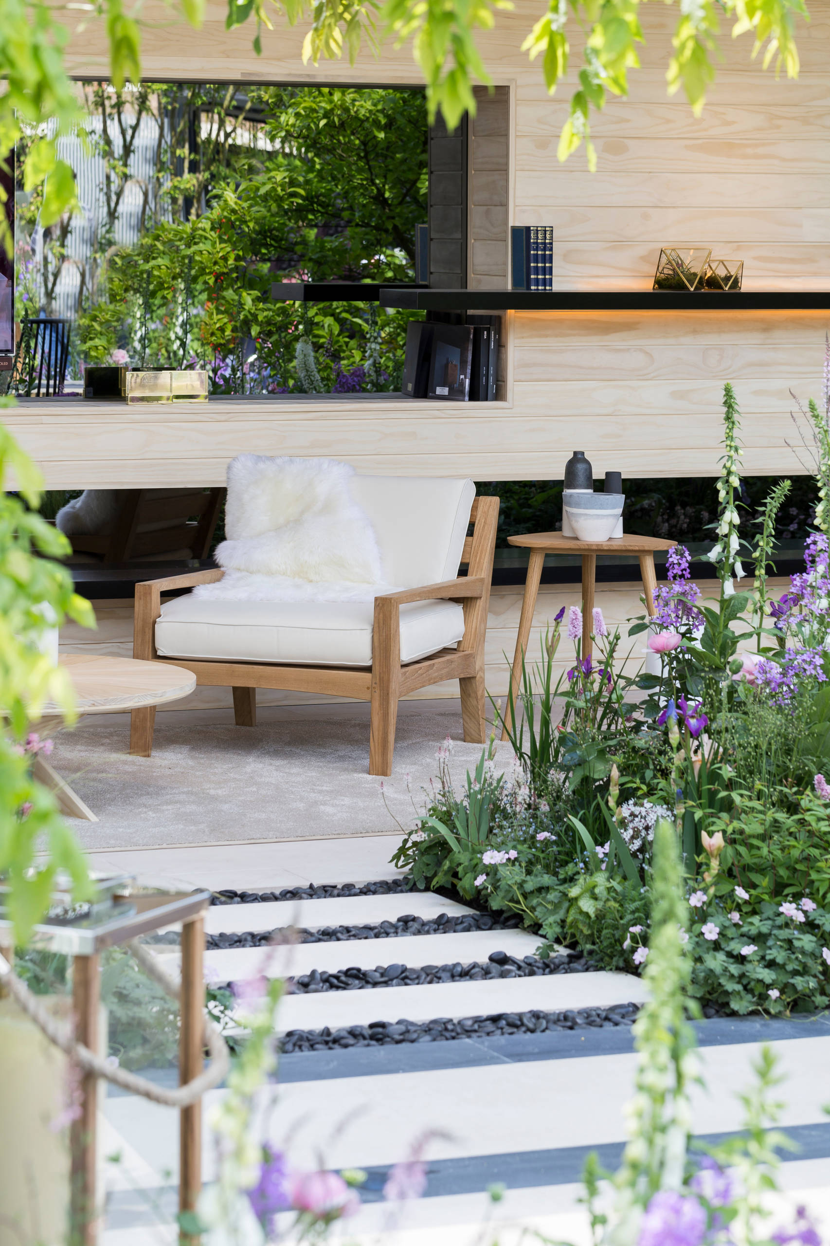 Garden chairs are in natural pale wood, and painted light grey and charcoal; they pick up the Scandi style of the “interior” space while complementing the soft, pastel-coloured planting.