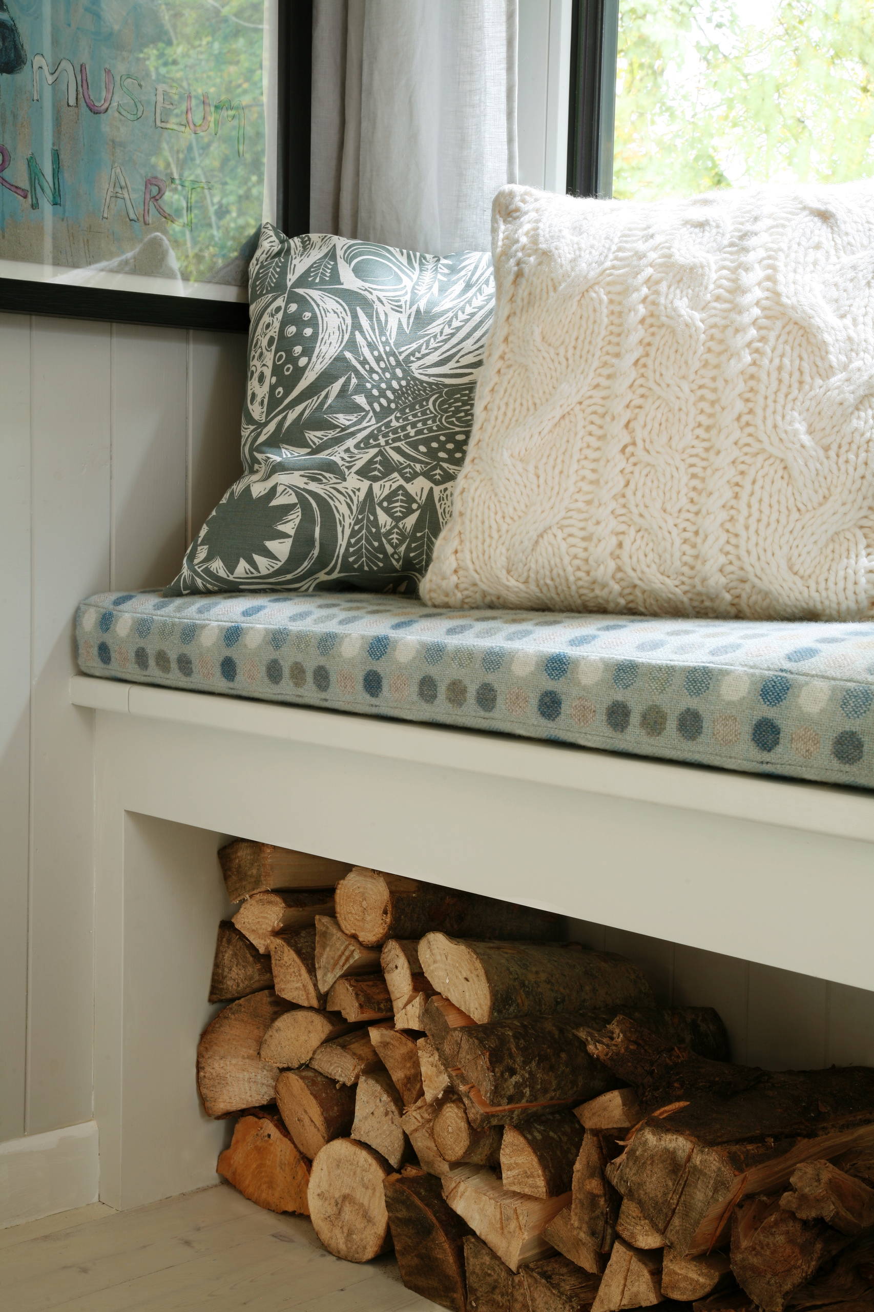 Window seat, built by Liam Clancy. Seat cushion, made from a Melin Tregwynt throw. Blue and white cushion, made by homeowner from a Mark Hearld-designed fabric, Bird Garden, St Judes. Chunky-knit cushion, H&M Home. Limited-edition print by Peter Doig for Irish Museum of Modern Art. Cove 2B wood-burning stove and boiler in Almond, Charnwood. Lion ornament on mantel, Jonathan Adler. Beep lamp, Sebastian Conran.
