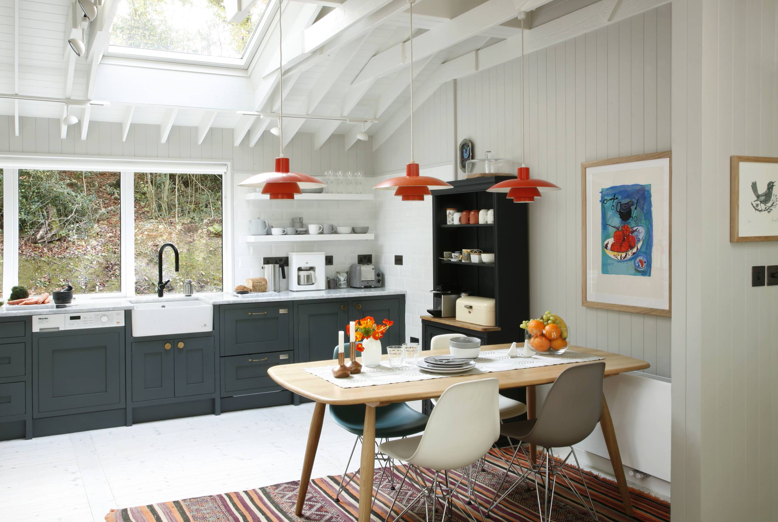 Plank dining table, Ercol Originals. Eames DSR chairs, Vitra, available at Nest. Orange Louis Poulson 4/3 pendant lamps, vintage. Moroccan rug, sourced in Marrakech. Large wall print, Chloe Cheese. Small wall prints, Tiny Showcase. Copper-finish candle holders, H&M Home.