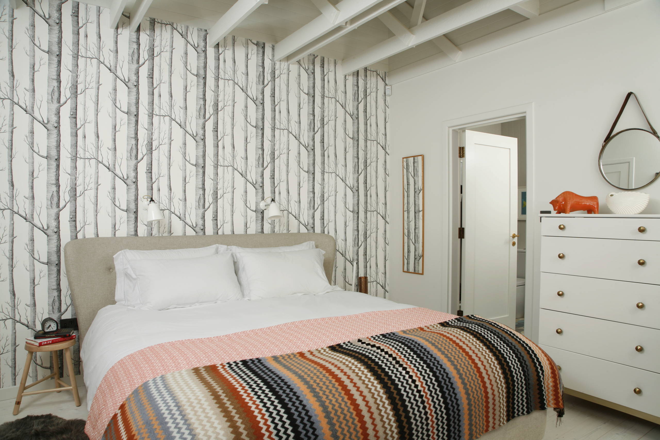 Humbert throw, Missoni. Woods wallpaper, Cole & Son. Hector wall lights, Original BTC. Floorboards treated with Woca Extra White colour oil, Dane Care.