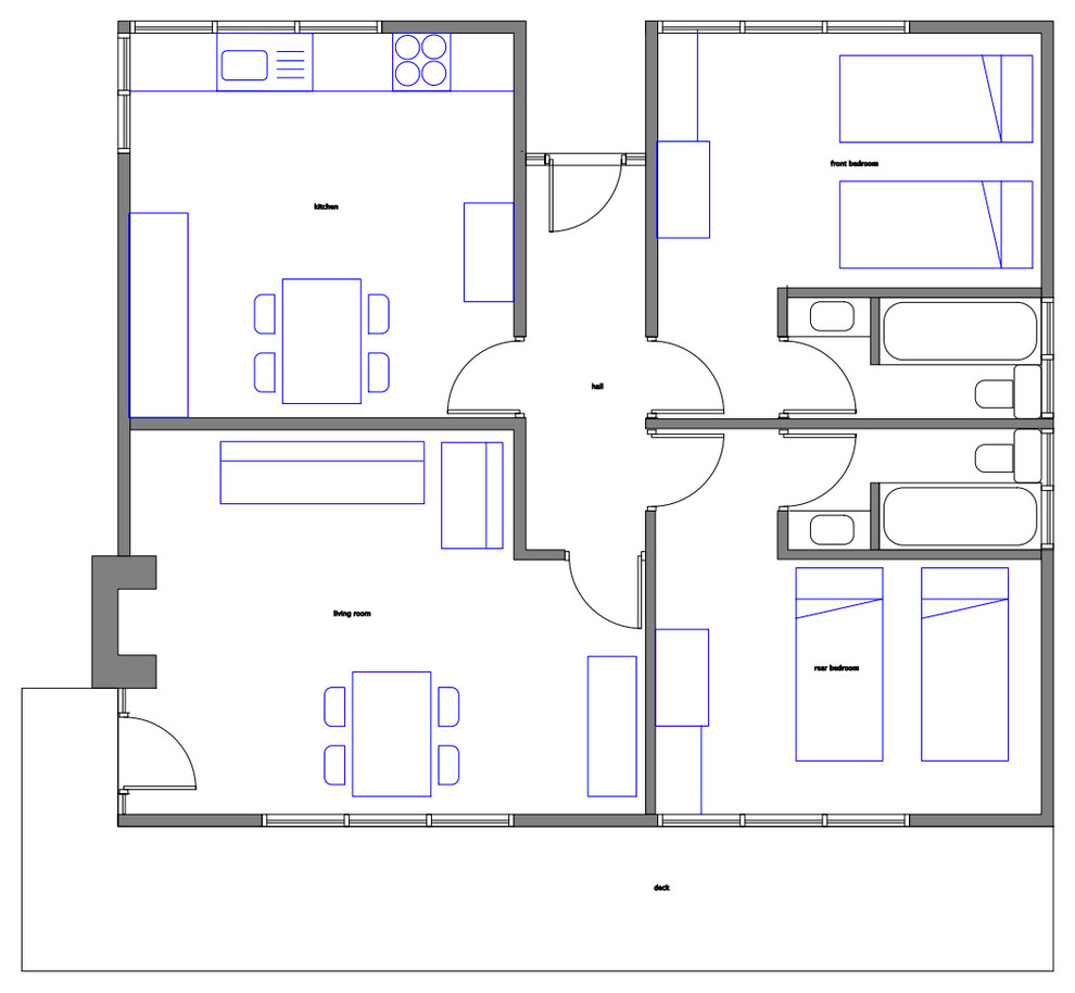 A floorplan of the finished project shows the new deck and the bathrooms extension.