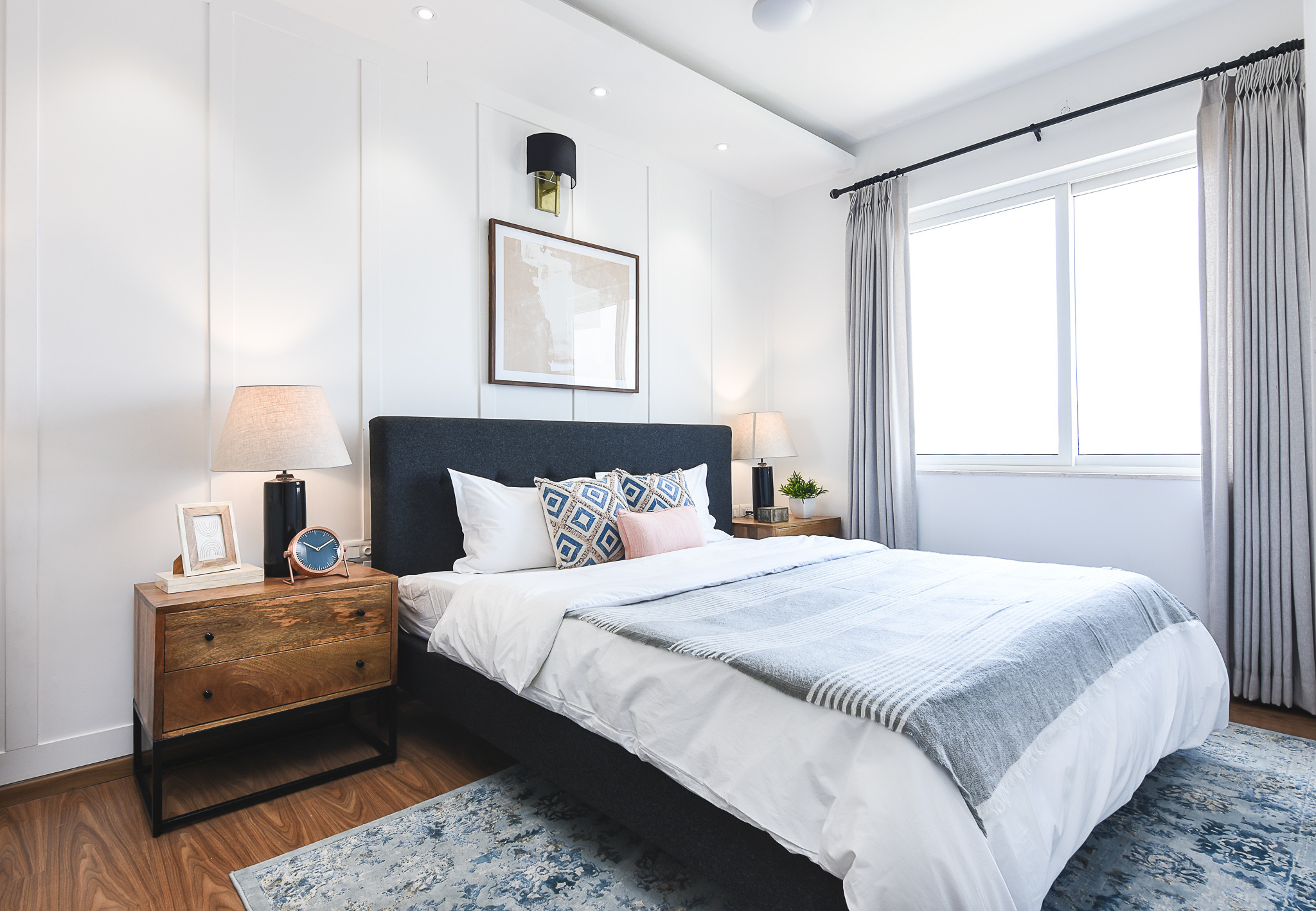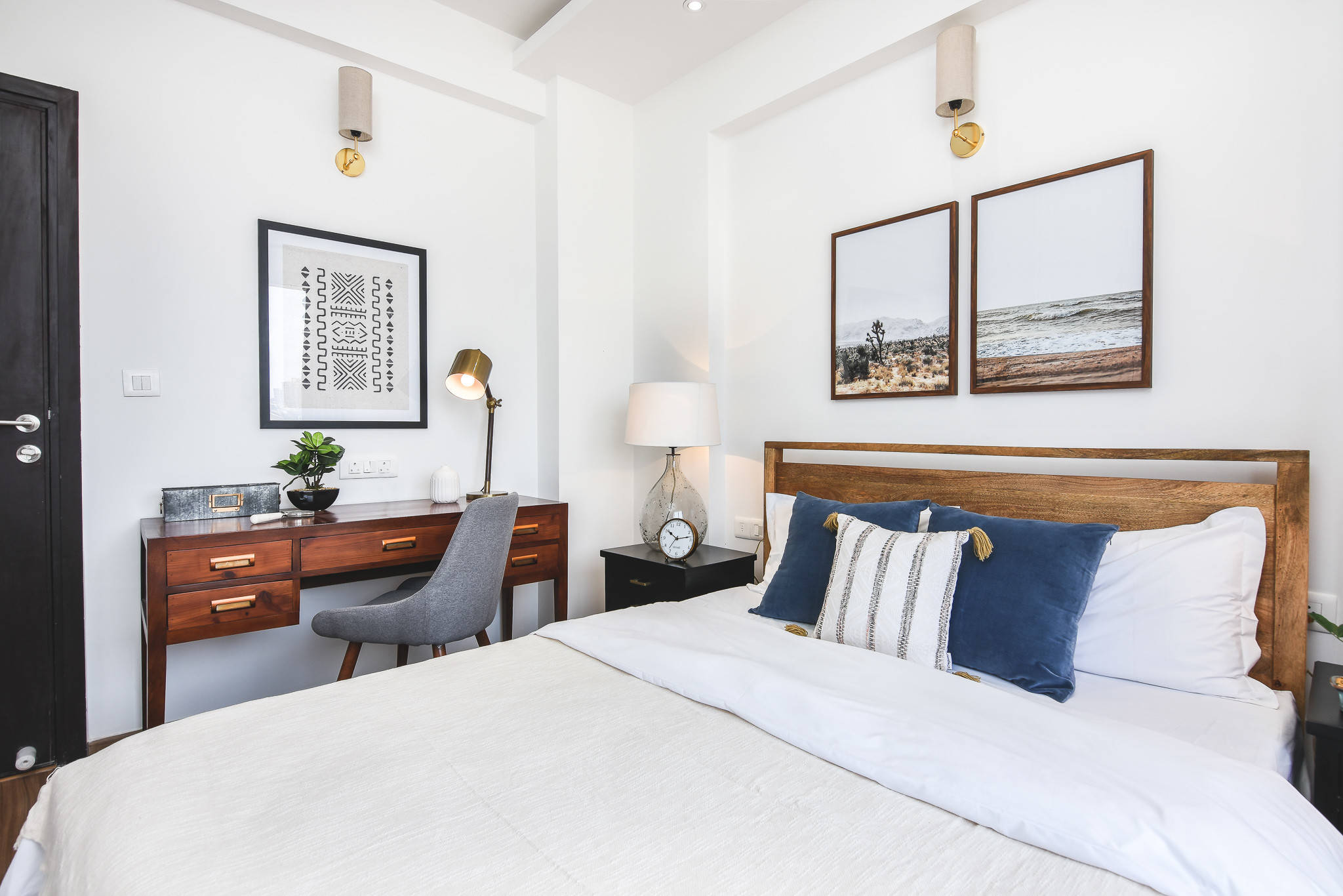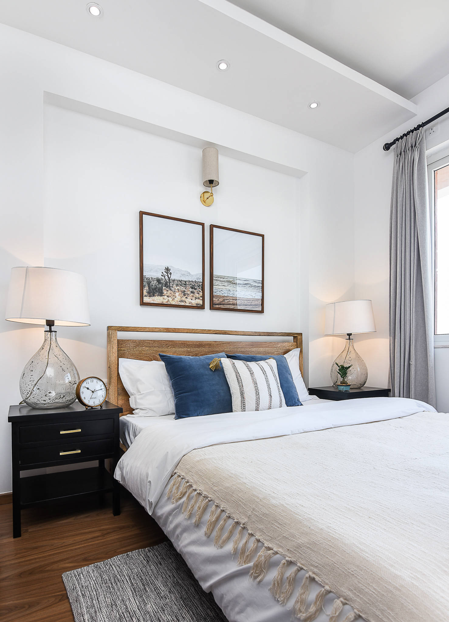 The guest bedroom continues the blue-and-white palette in the rest of the flat. A compact queen-size (small double) bed in a natural wood tone tames the starkness of the crisp white walls, while black bedside tables create a contrasting interplay with the surrounding neutral elements.