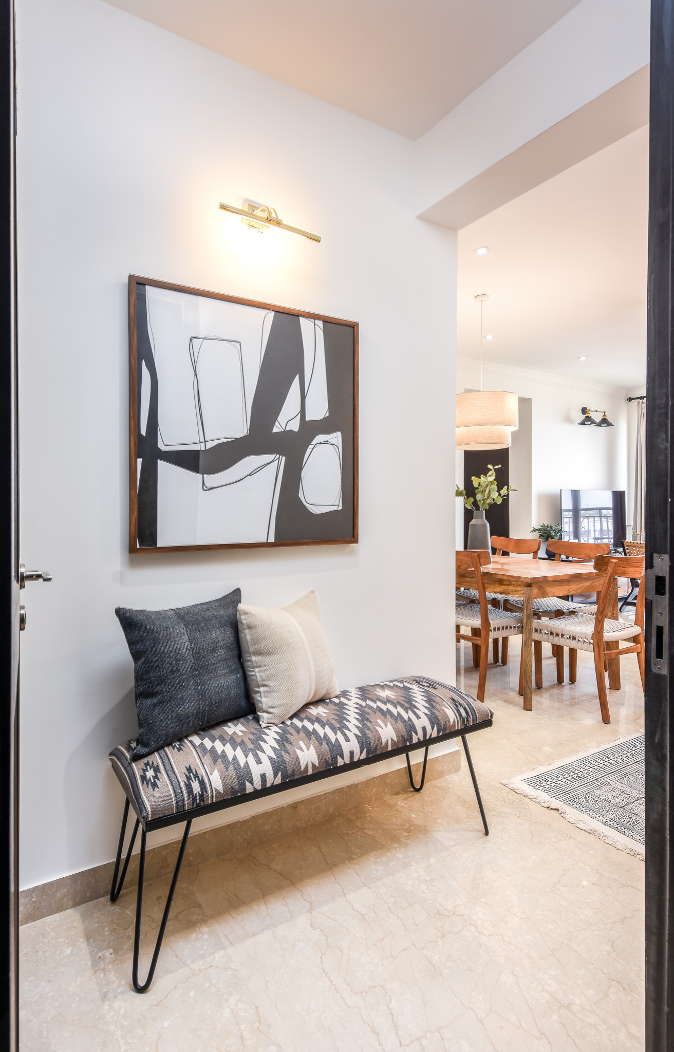The main door opens into a wide hallway characterised by monochrome accents. “We wanted to make the entry impactful, yet minimal,” Sunita says. “We went for a kilim-patterned upholstered bench with hairpin legs, and black-and-white abstract artwork.