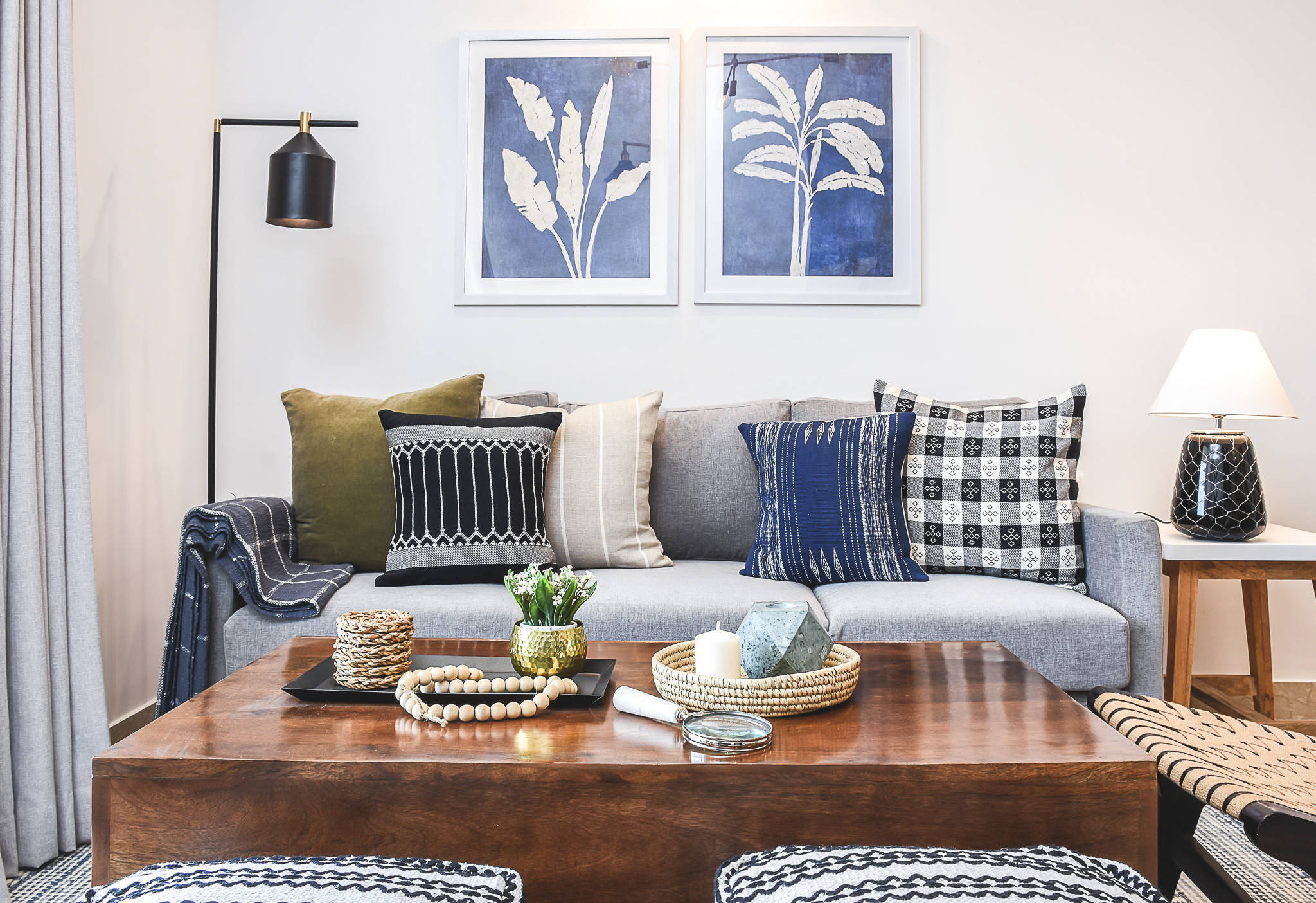 “We opted for neutral colours for the sofa, pouffes and coffee table, and infused vibrancy and texture through artwork, textiles and other décor elements,” Sunita says. “We also juxtaposed an assortment of wood tones to add visual variety to the aesthetic.”