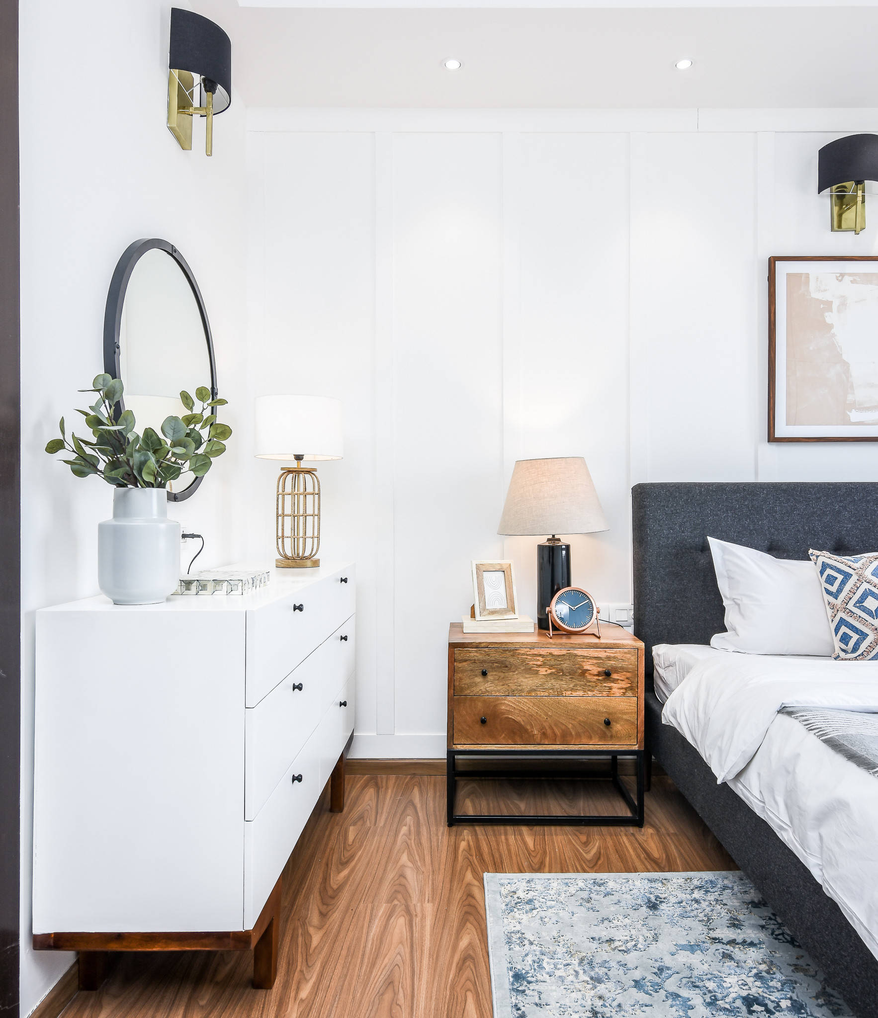 “We chose board-and-batten panelling for the wall to conjure a sense of form and texture, and crafted a minimalist vignette on the chest of drawers for a sophisticated appeal,” Sunita says.