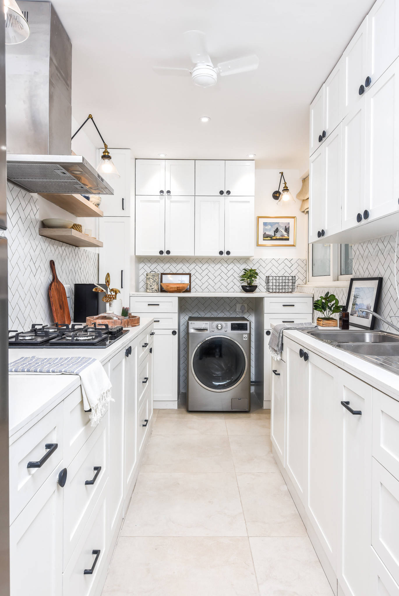 “The owner’s dream was to have an all-white kitchen. So we tore down the shell and started from scratch. We opted for a herringbone splashback, quartz worktop and Shaker-style cabinets in an all-white palette,” Sunita says.