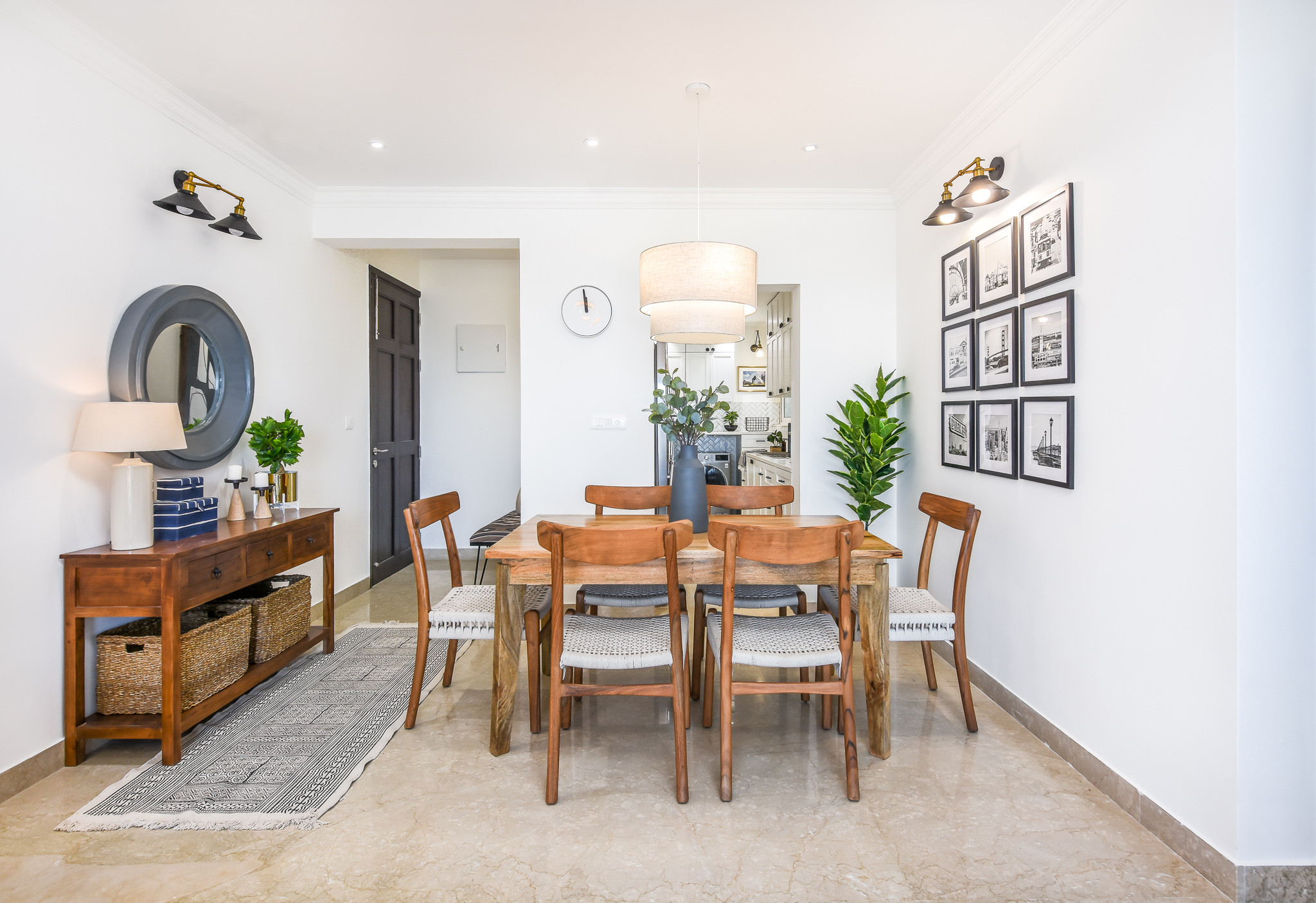 “We defined the dining zone with a grid gallery wall featuring prints of San Francisco on one side, and a wooden console table showcasing a chic, coastal-themed vignette on the other. The dining chairs, embellished with woven details, add texture to the muted shell,” Sunita says.