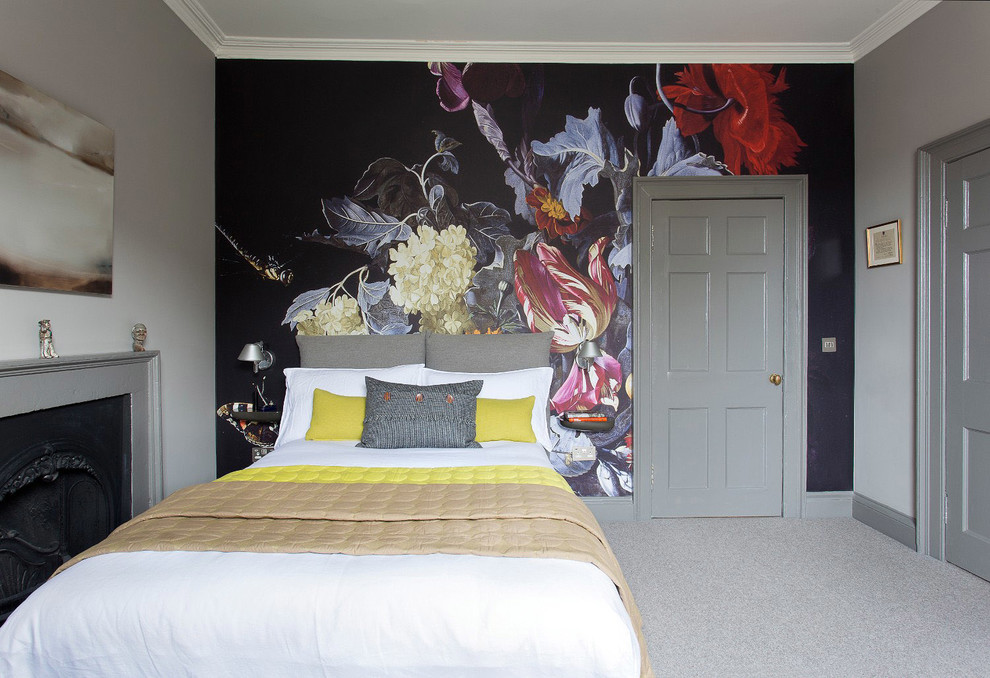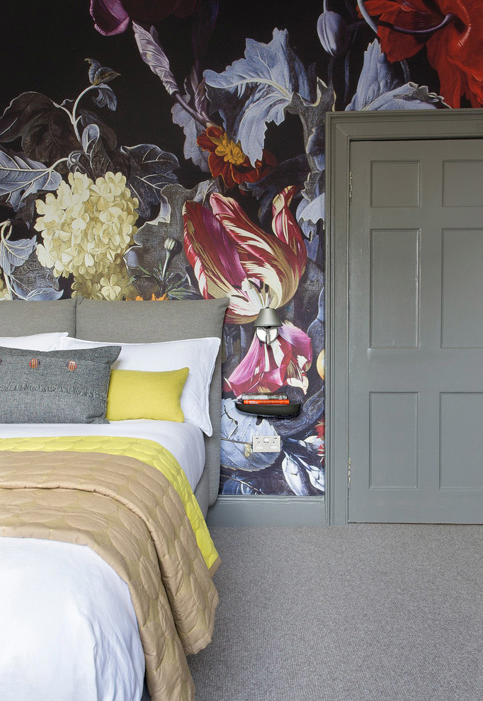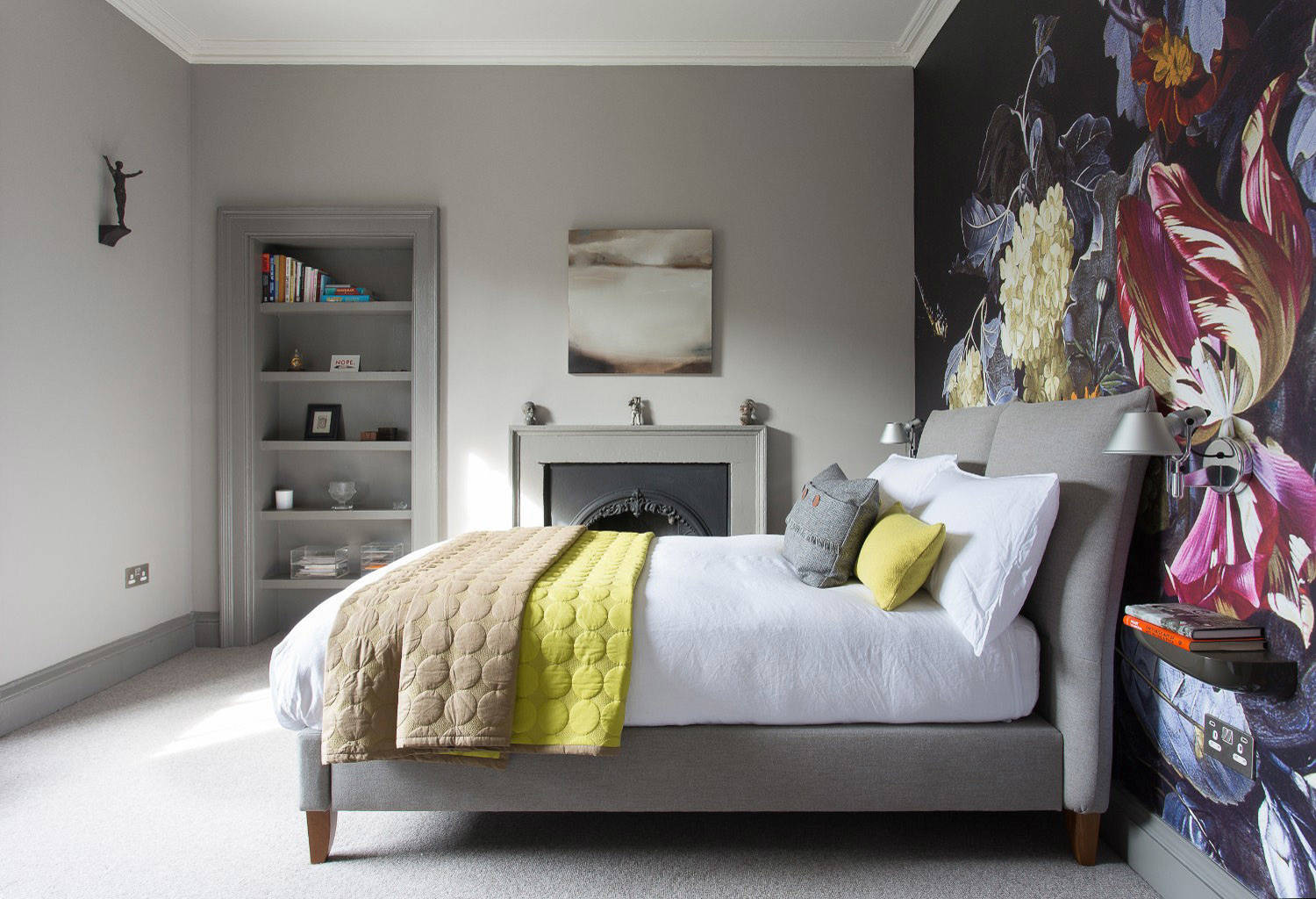 An upholstered bed continues the grey tones of the room’s scheme, as well as its relaxing feel.
