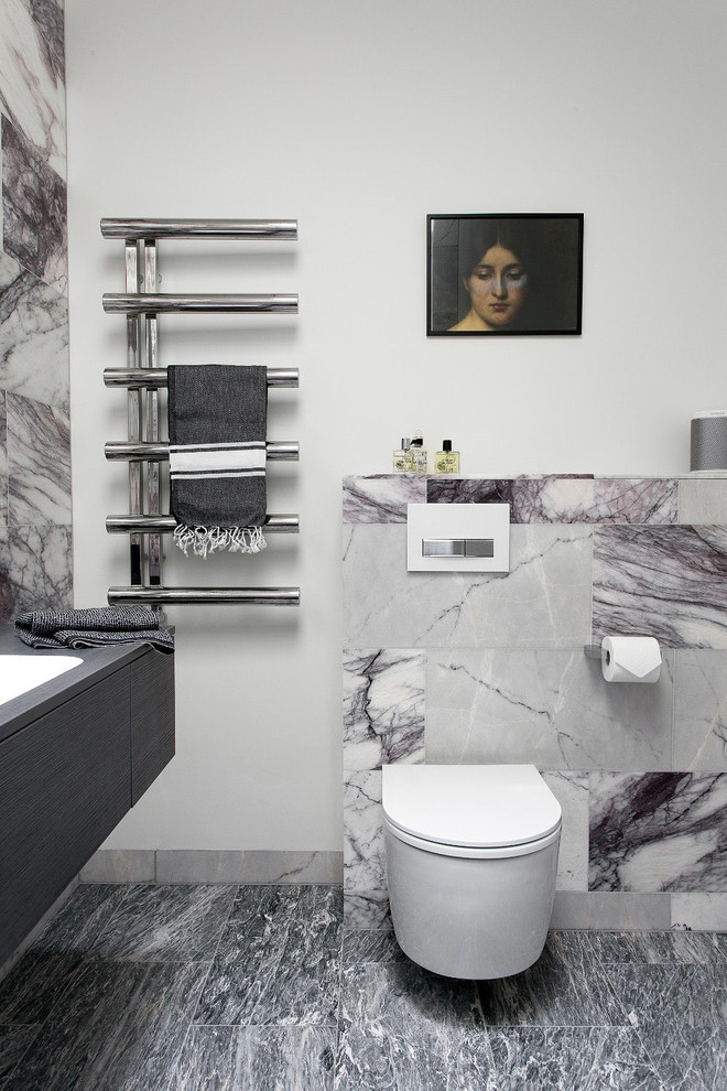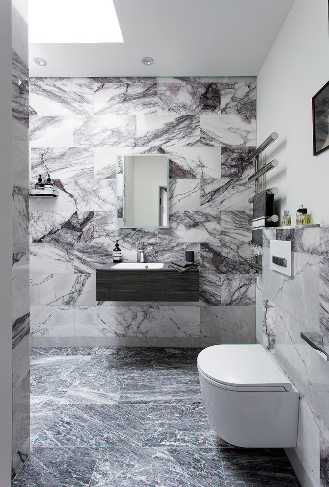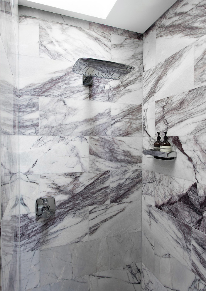 Calacatta Viola marble wall tiles; Manhattan honed marble floor tiles, all Mandarin Stone.