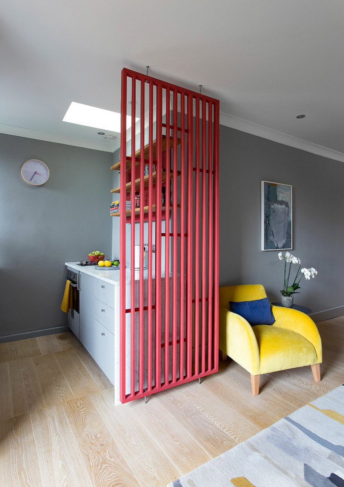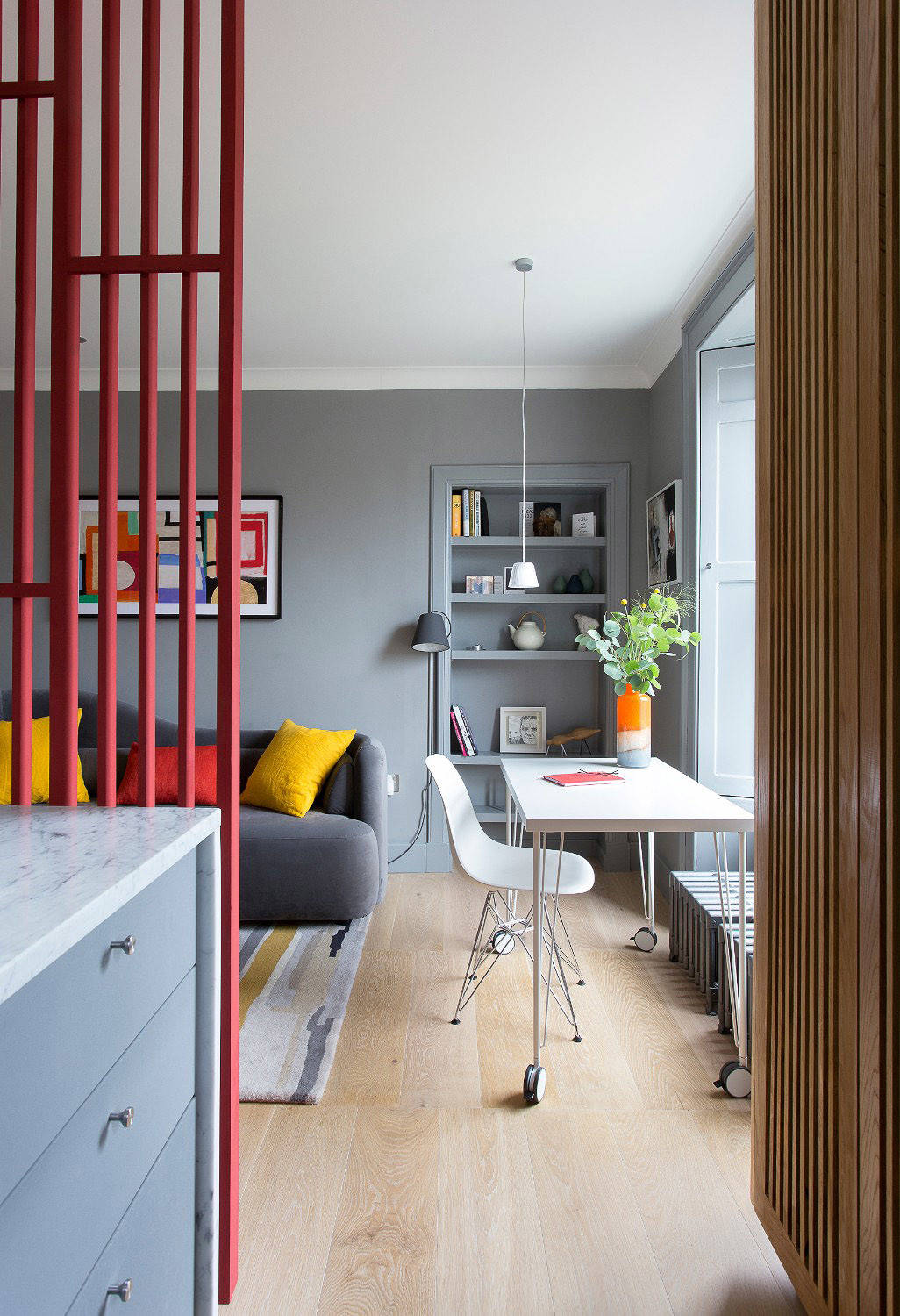 The flat’s living room is open to the kitchen and had to incorporate a space for dining, too.