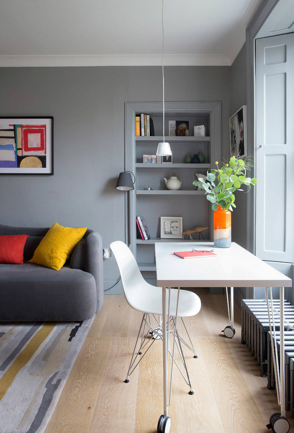 The flat’s bedroom has a dramatic wall mural behind the bed – a detail from a 17th century Dutch painting. The bold backdrop is teamed with grey on the remaining walls and woodwork, but the shades are warmer than in the living space.