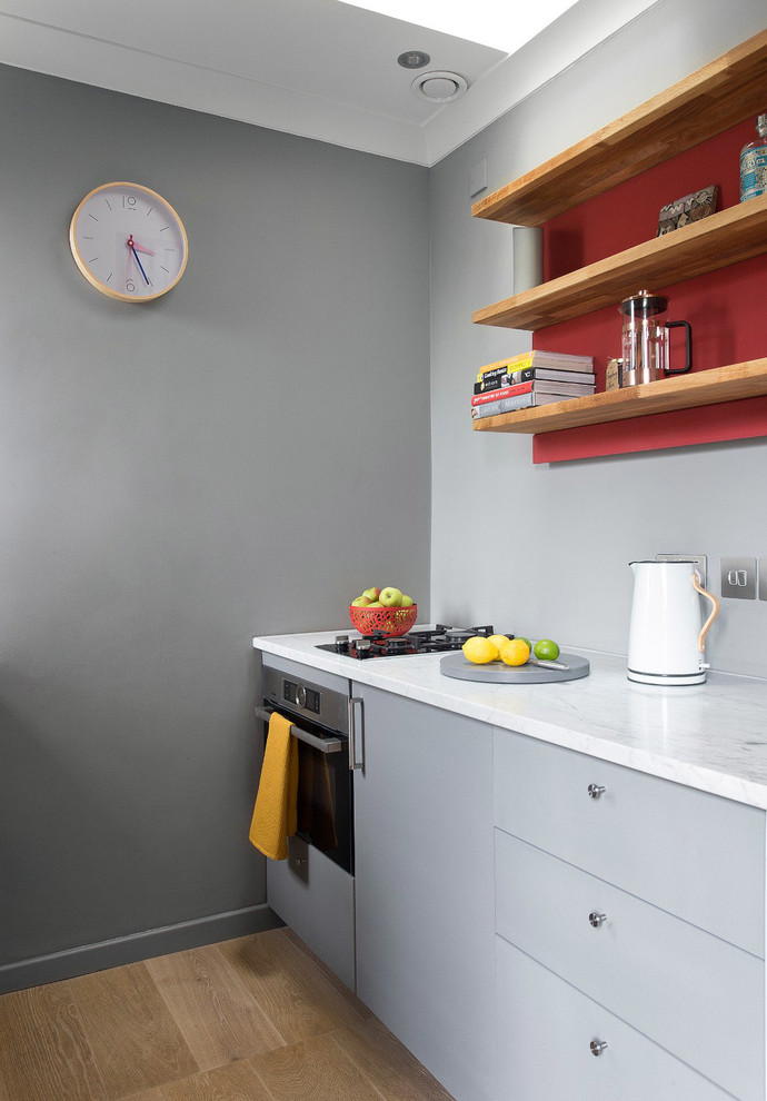 The alcove wasn’t quite large enough to accommodate everything that was needed to make a practical working kitchen, so it extends slightly into the living area. John therefore chose to wrap the marble worktop around the end of the units, so the whole appears as a marble block.
