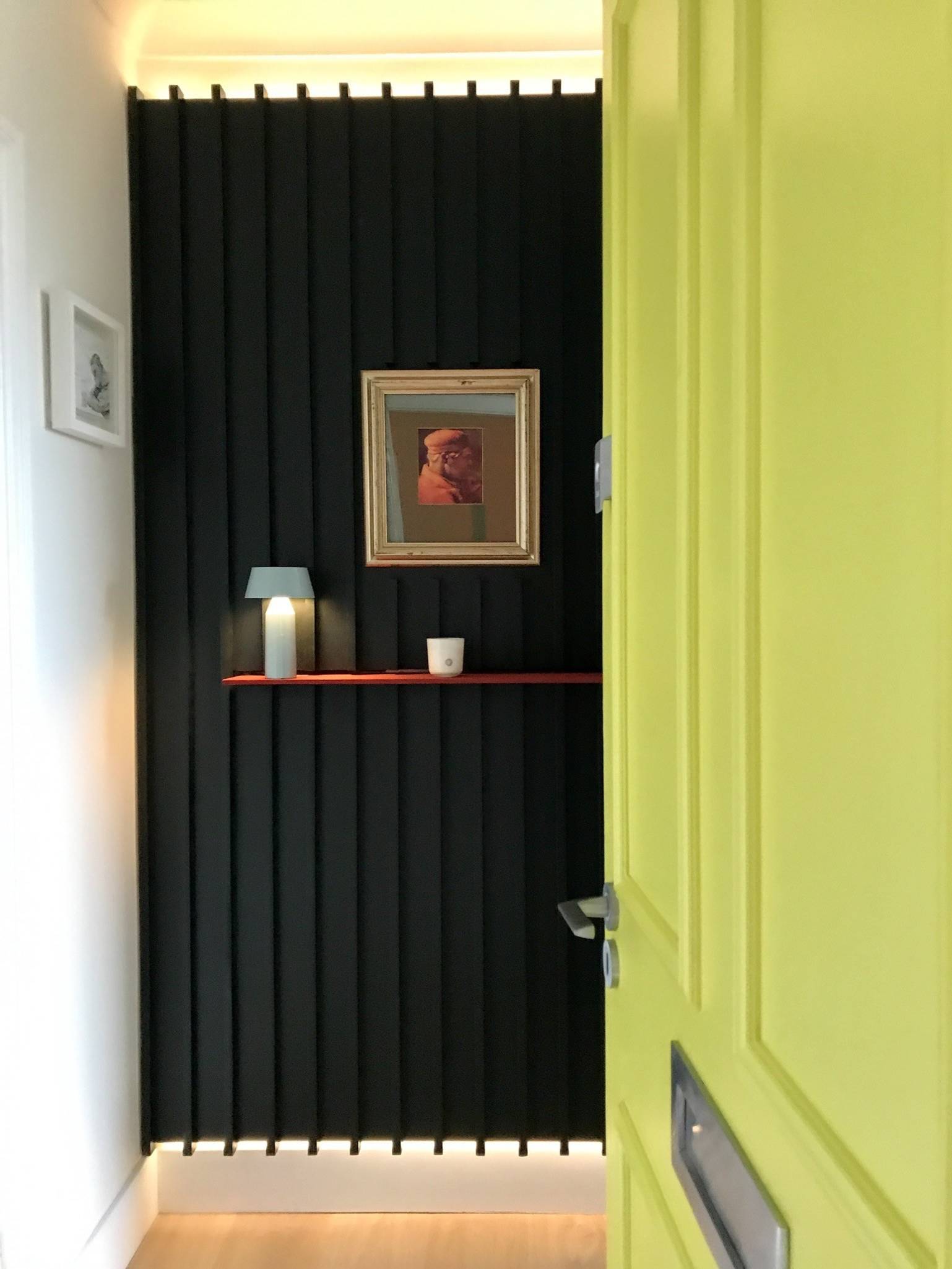 The flat’s owner collects art and the first painting he bought is showcased against the panelling as soon as you step through the front door. A steel shelf below makes space for a lamp and candle.