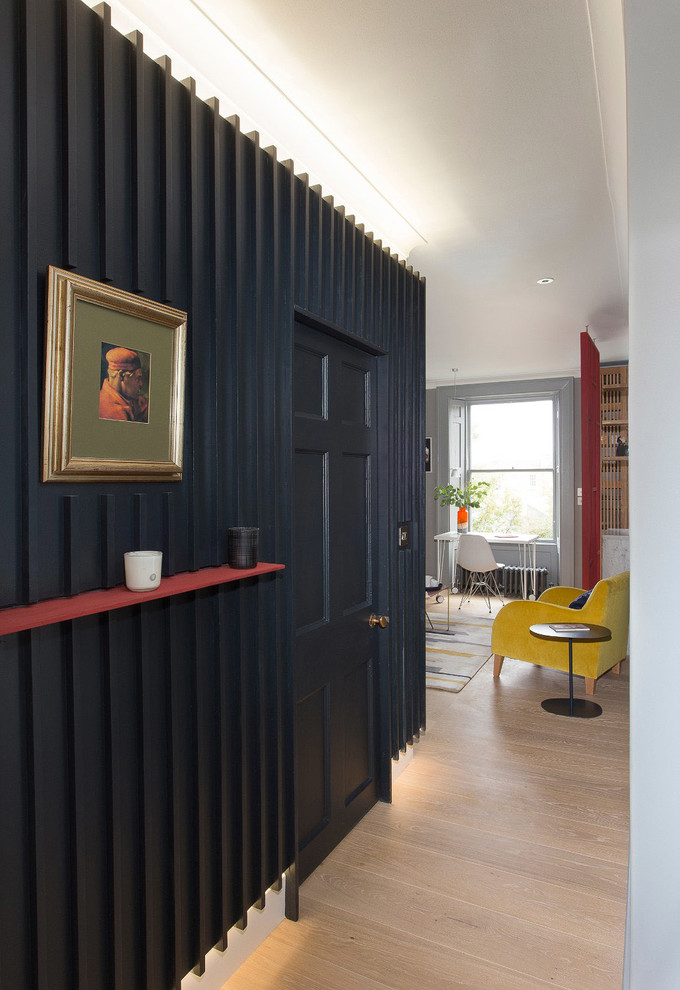 The hallway leads out of the living area, and is fitted with bespoke panelling designed by John. “It needed something to create interest,” he says. Concealed LED lighting at the top and bottom gives the illusion the panelling is floating.