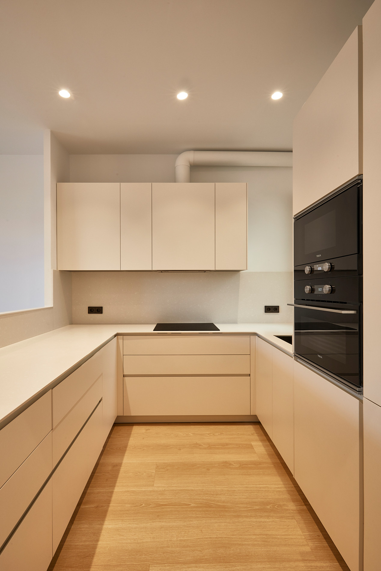 “We wanted to use monochrome tones in the kitchen and use the taps, small window (see previous photo) and appliances to provide contrast,” Genís says. “It was difficult to find a material that would allow us to stick with the monochrome colour scheme while also creating minimalist lines and staying within budget.” The kitchen came out to a total of €5,298.75 (around £4,488).