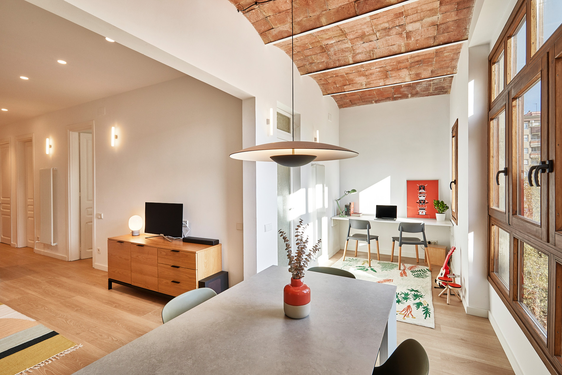 The traditional Catalan vaulted ceiling and the wooden joinery of the loggia windows were restored to look similar to the originals.