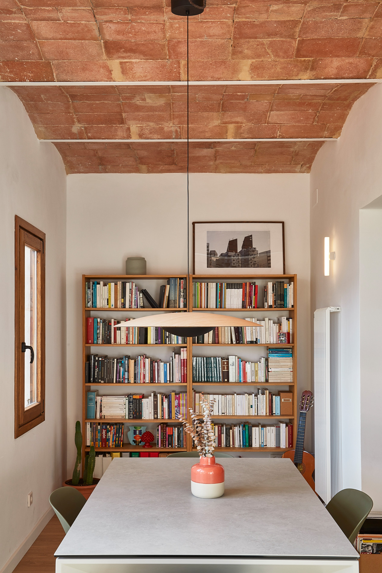 “The colour of the woods used in the loggia was key. The light oak of the floor brightens up the space, while the oak window frames are older and darker, plus there’s the accent provided by the oak lamp. These tones combine to add serenity to a unique space,” Genís says. “The traditional Catalan vaulted ceiling is original; we gave it a matt protective varnish for a natural look.”