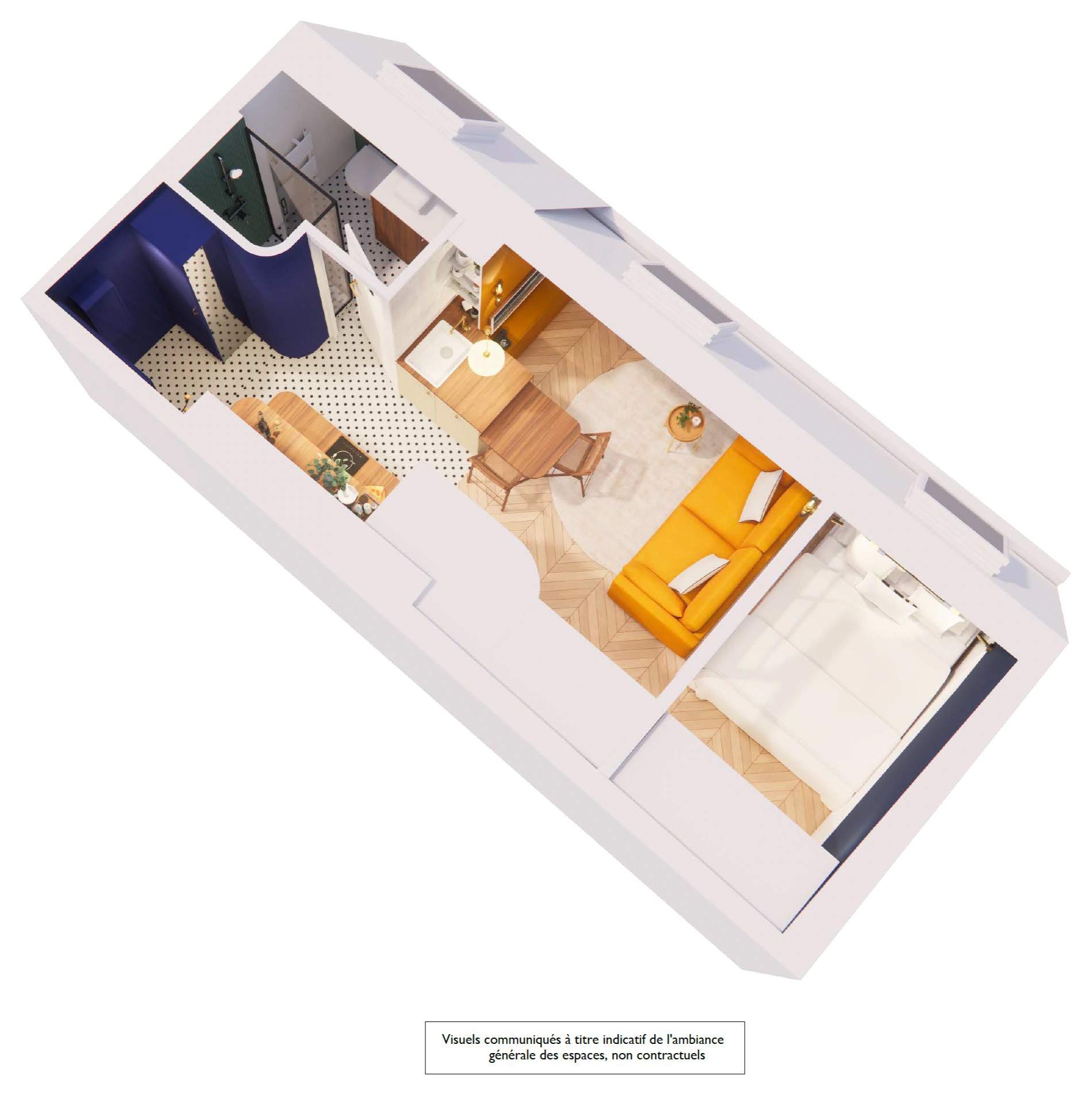 On the other side of the rounded wall is the shower and the rest of the bathroom. In front of that is the kitchen, running along either side of the main walkway, which then gives way to a living area.