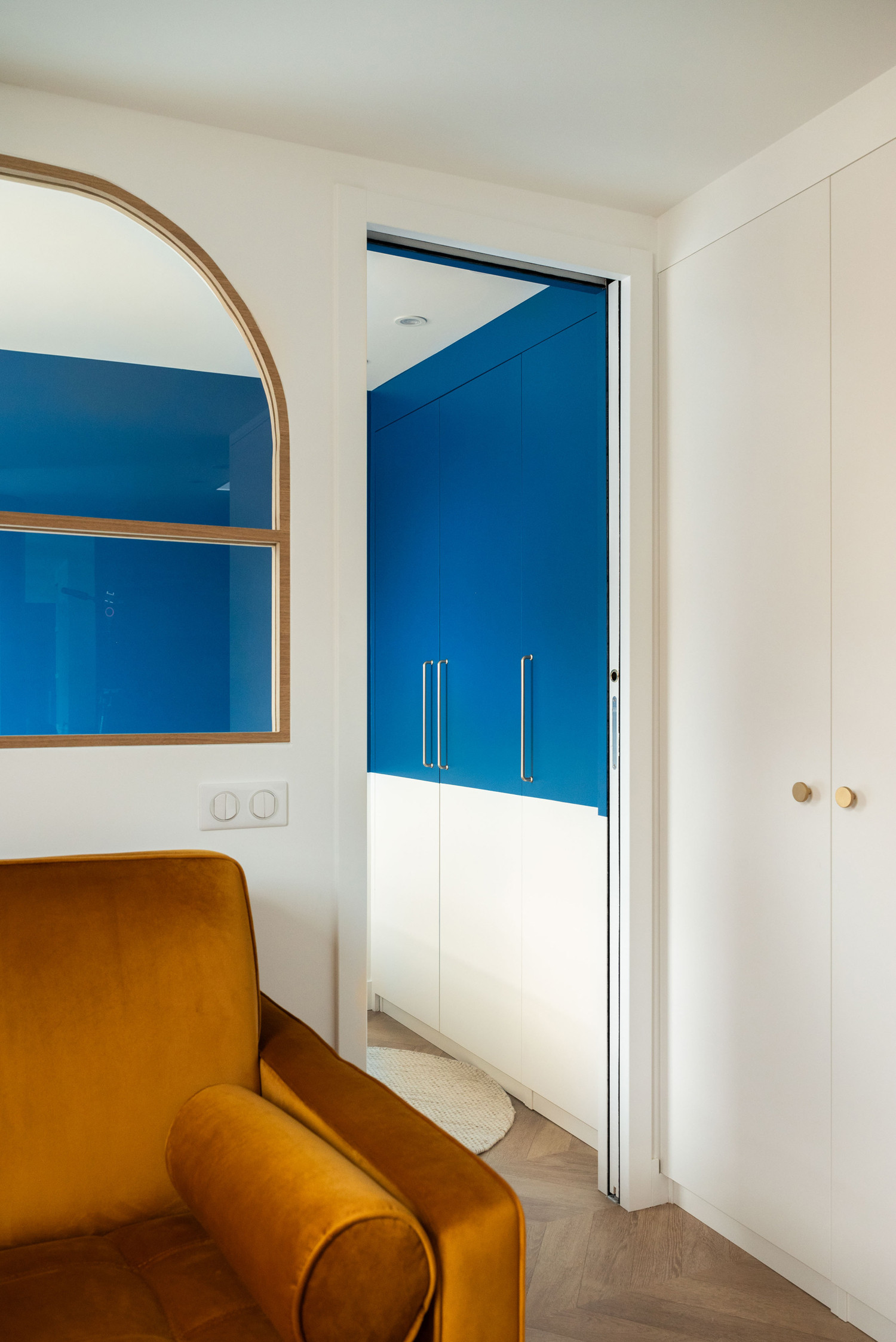 For a bespoke look, she painted some of the storage doors, along with the walls, in the owner’s favourite blue. “We often paint the lower part of the walls in a colour and the upper part in white, but here we’ve reversed this to reinforce the cocoon effect,” she says.
