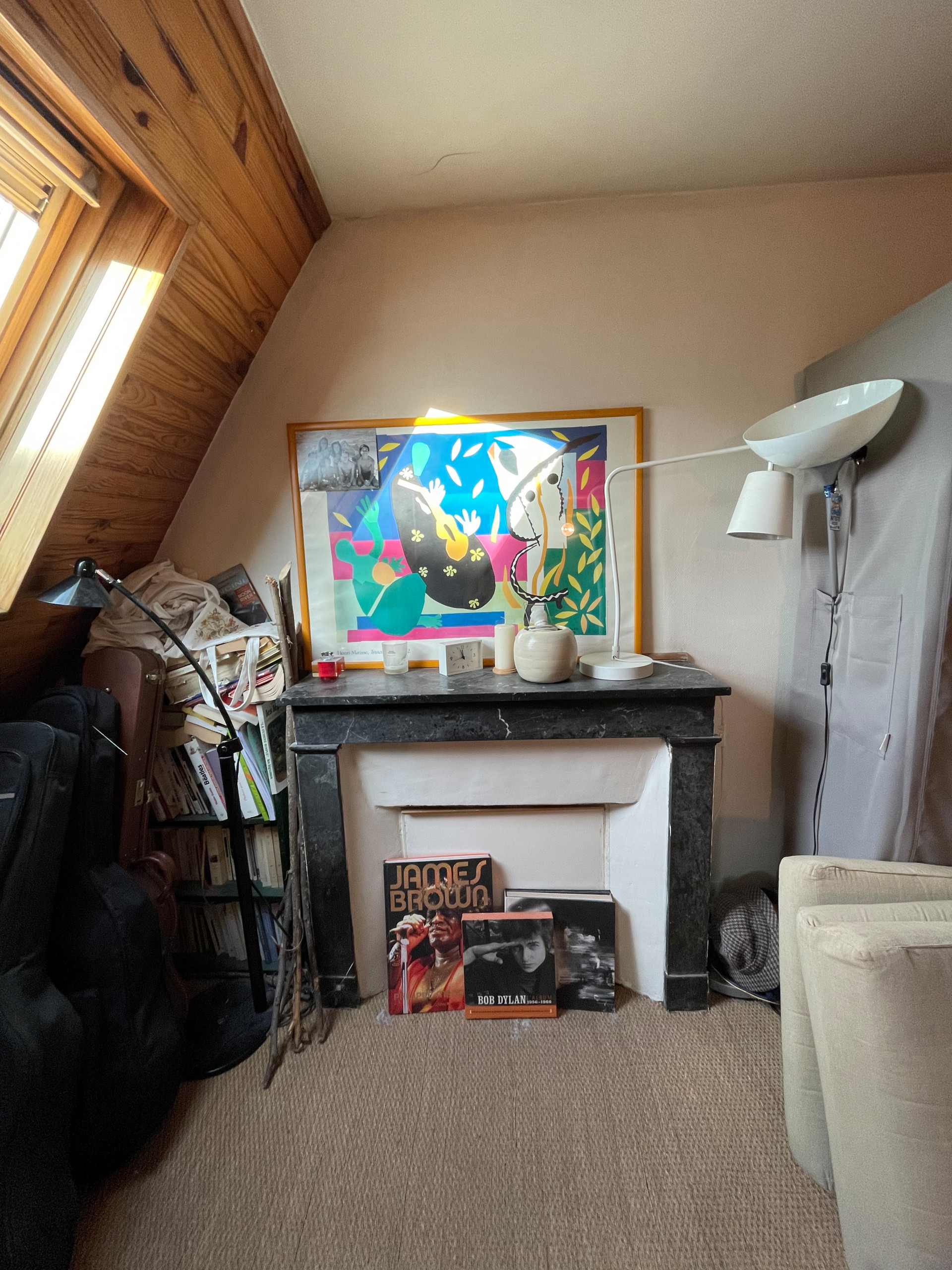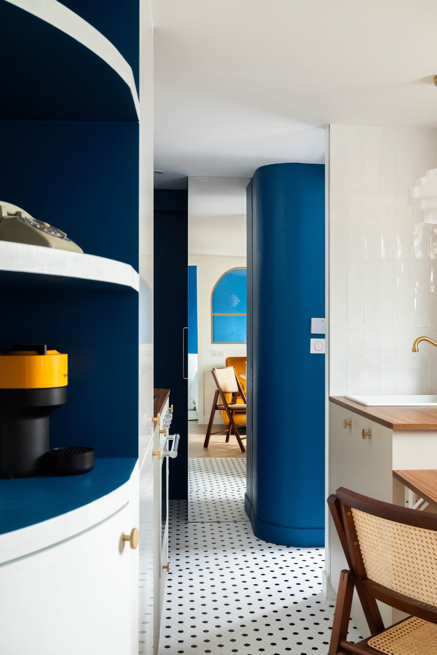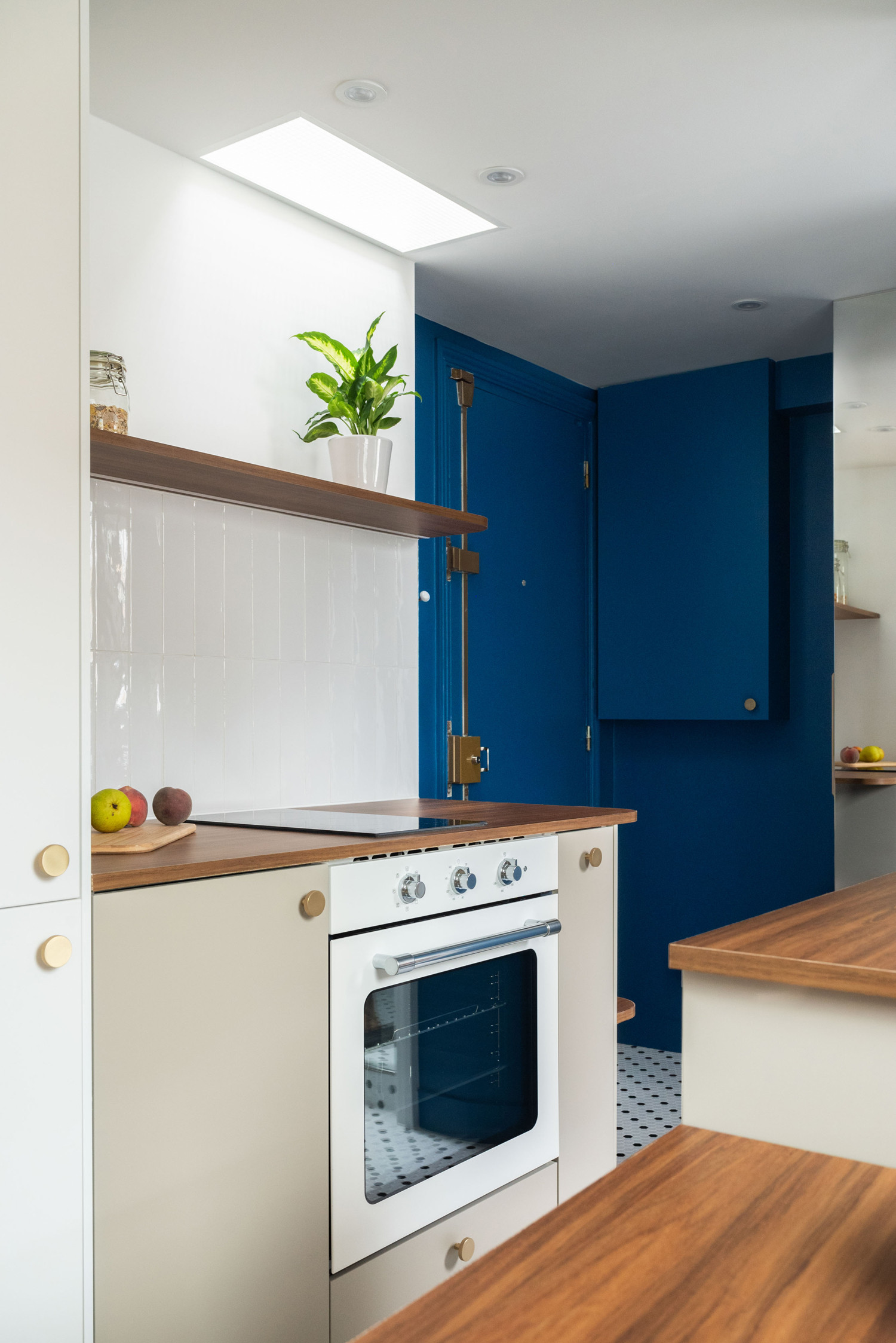 However, the space did have some redeeming features, namely “three beautiful, brand-new Velux windows”, and she appreciated that the owner had a very clear design style. “He collected old telephones and loved the ‘pop years’ [1956 to 1968]. He immediately wanted dark wood and electric blue,” recalls Alicia, who compensated for the narrowness of the space by going bold with the decor.