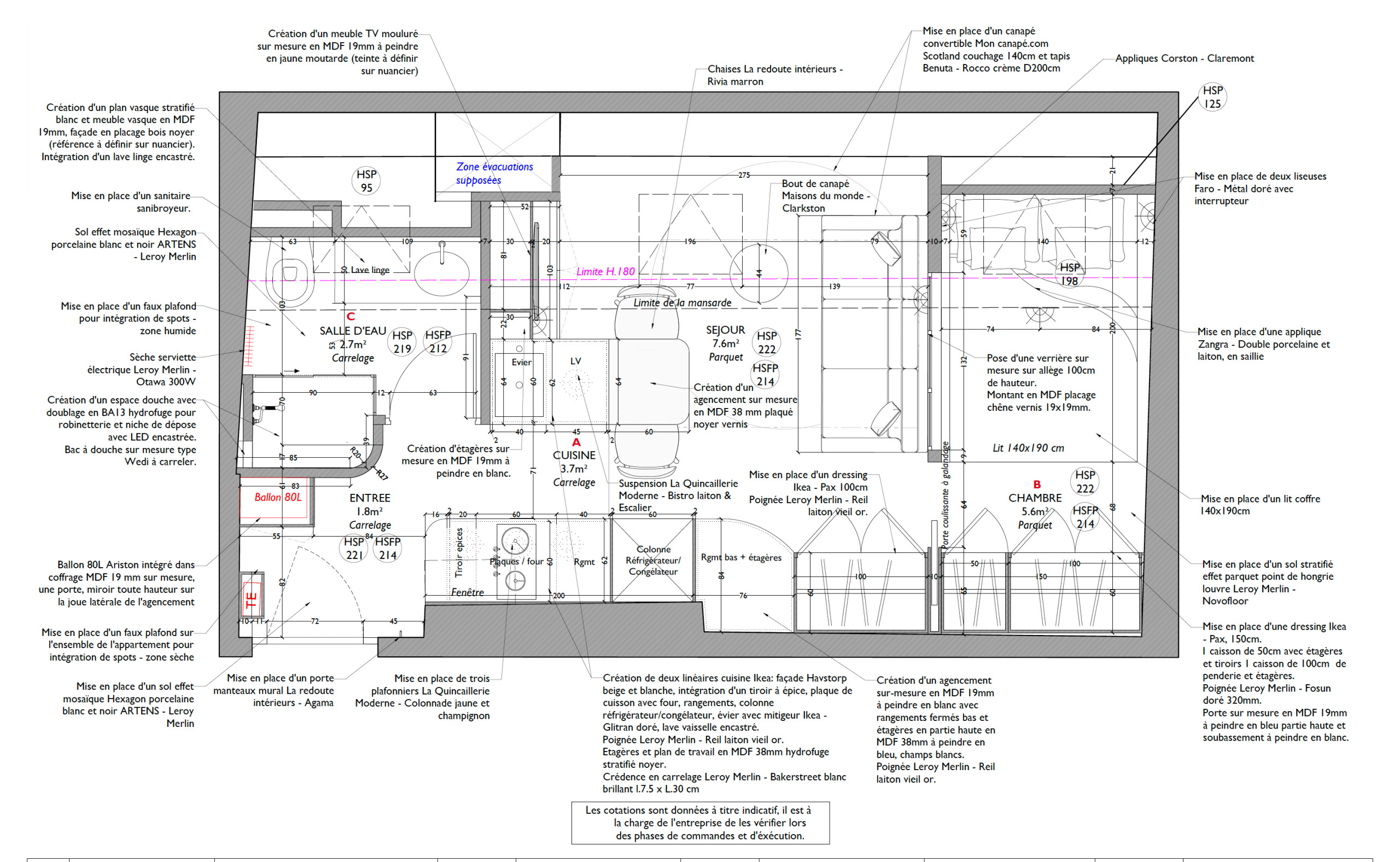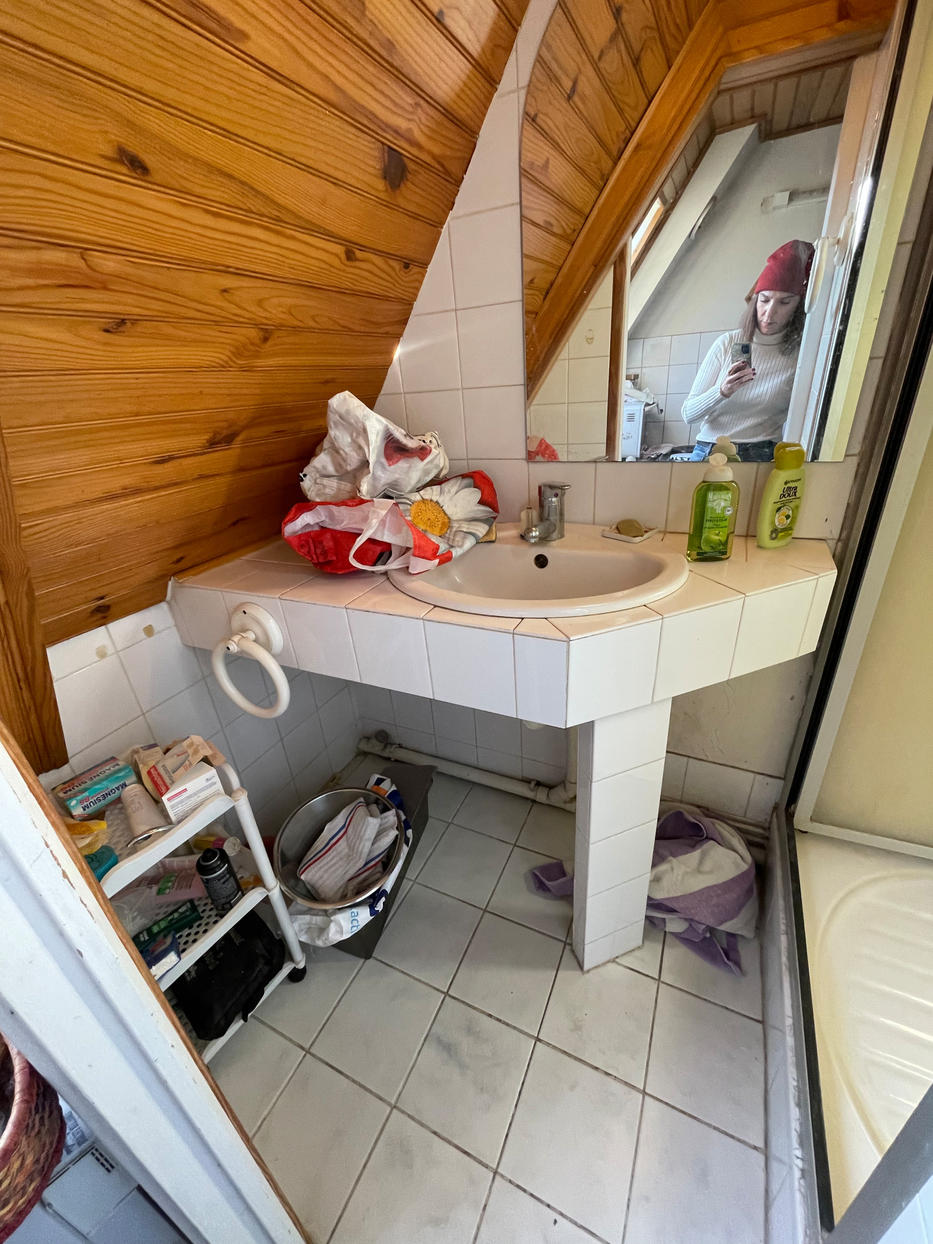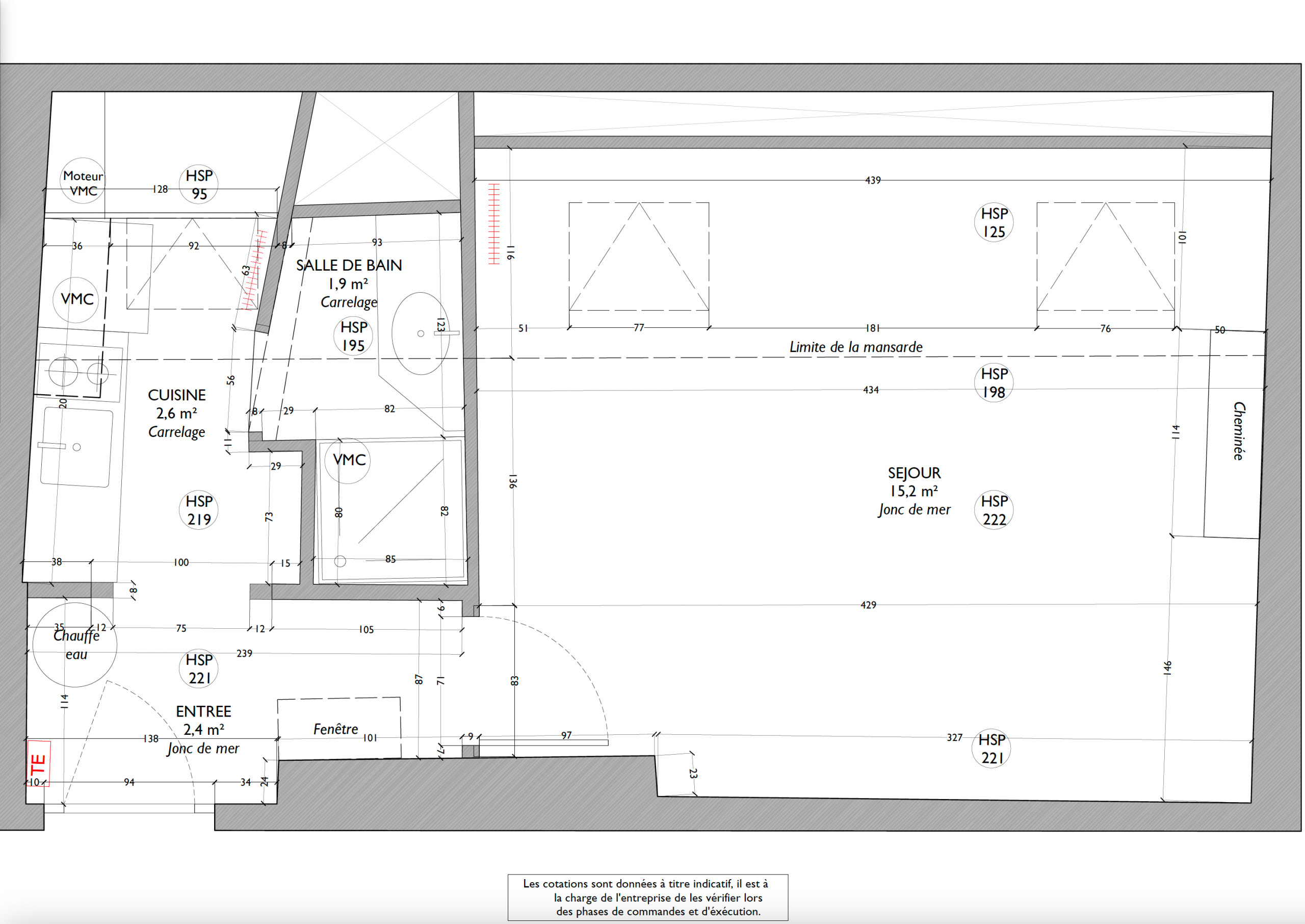 The new floor plan was dictated by two major constraints – the drains being the main one. The only drainpipe was at the level of the shower on the plan above, but not on the floor, in the ceiling! That’s why there was already a pump under the kitchen sink.