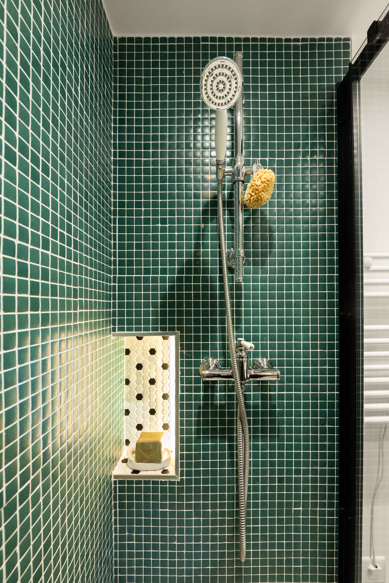The shower was positioned at the highest part of the bathroom, with a nicely rounded edge at the entrance (seen in the first photo). The result is a comfortable 90cm × 68cm shower. Alicia even included a niche for products, adorned with the same hexagonal pattern as on the floor.