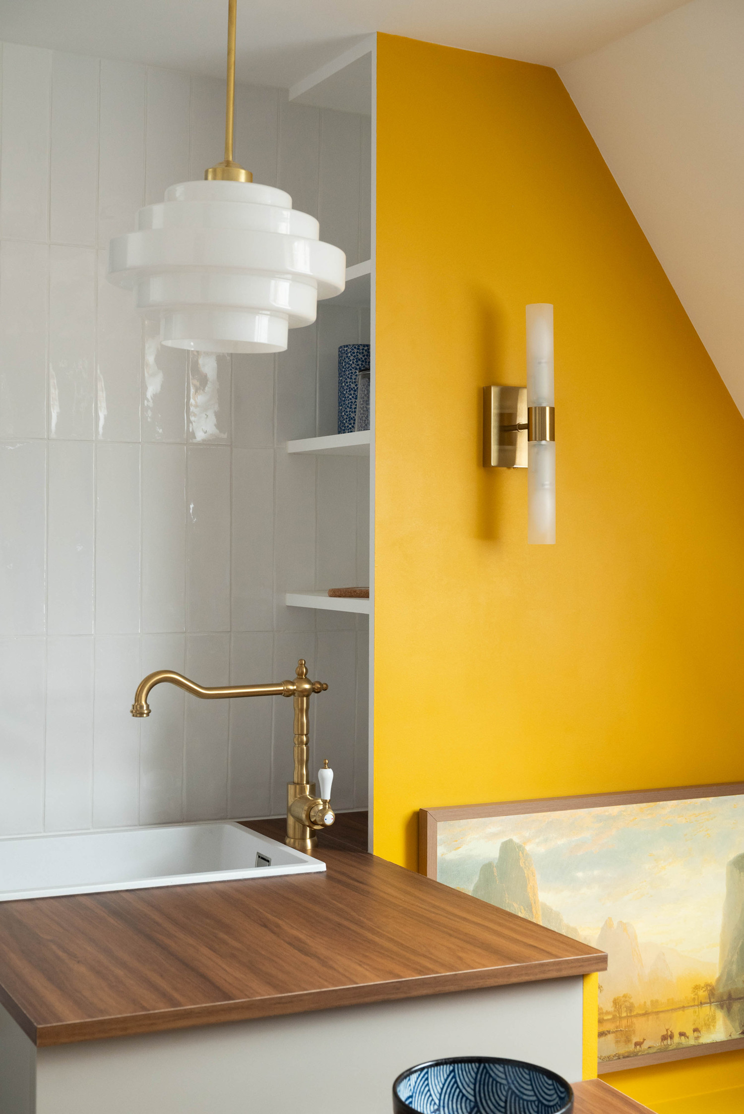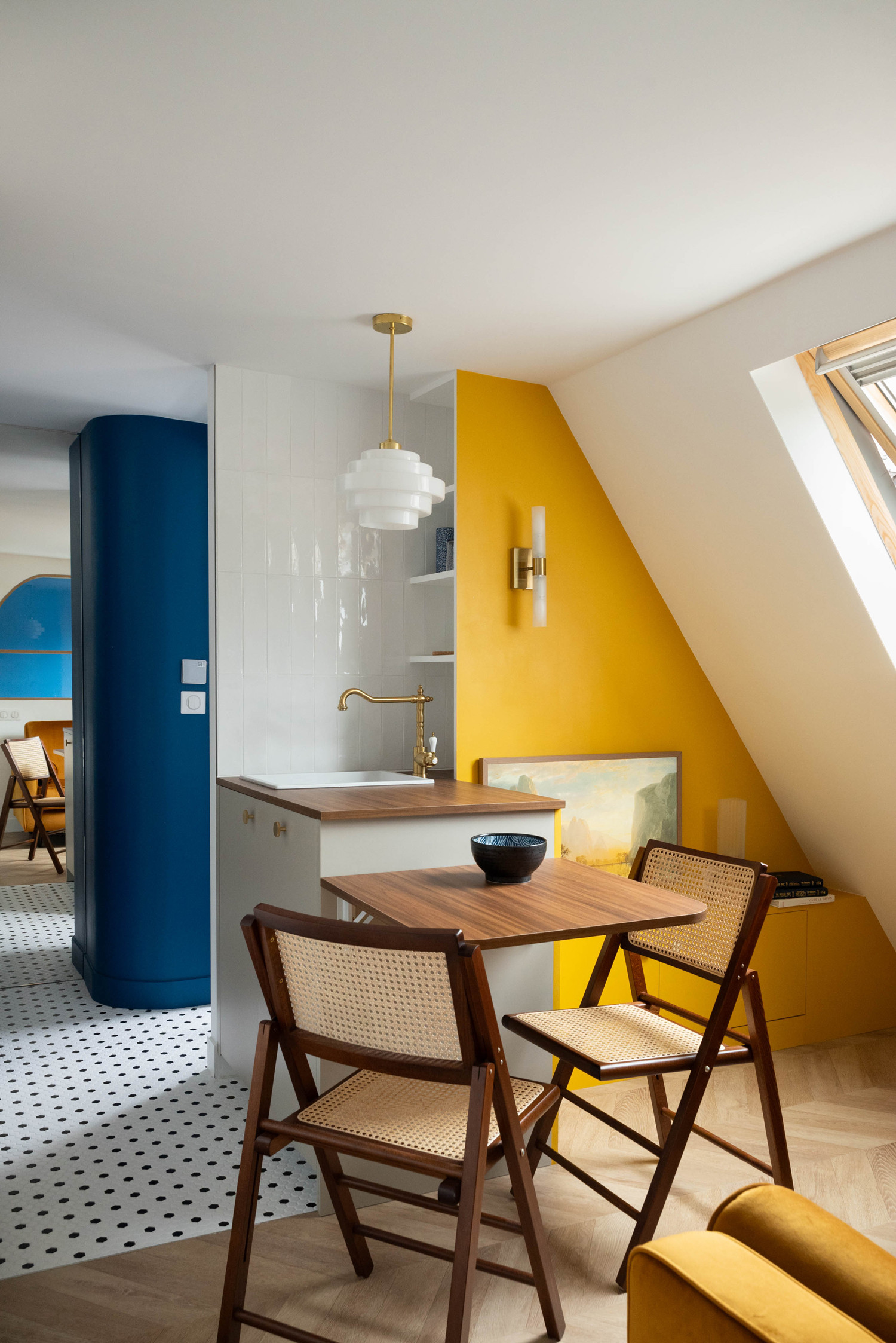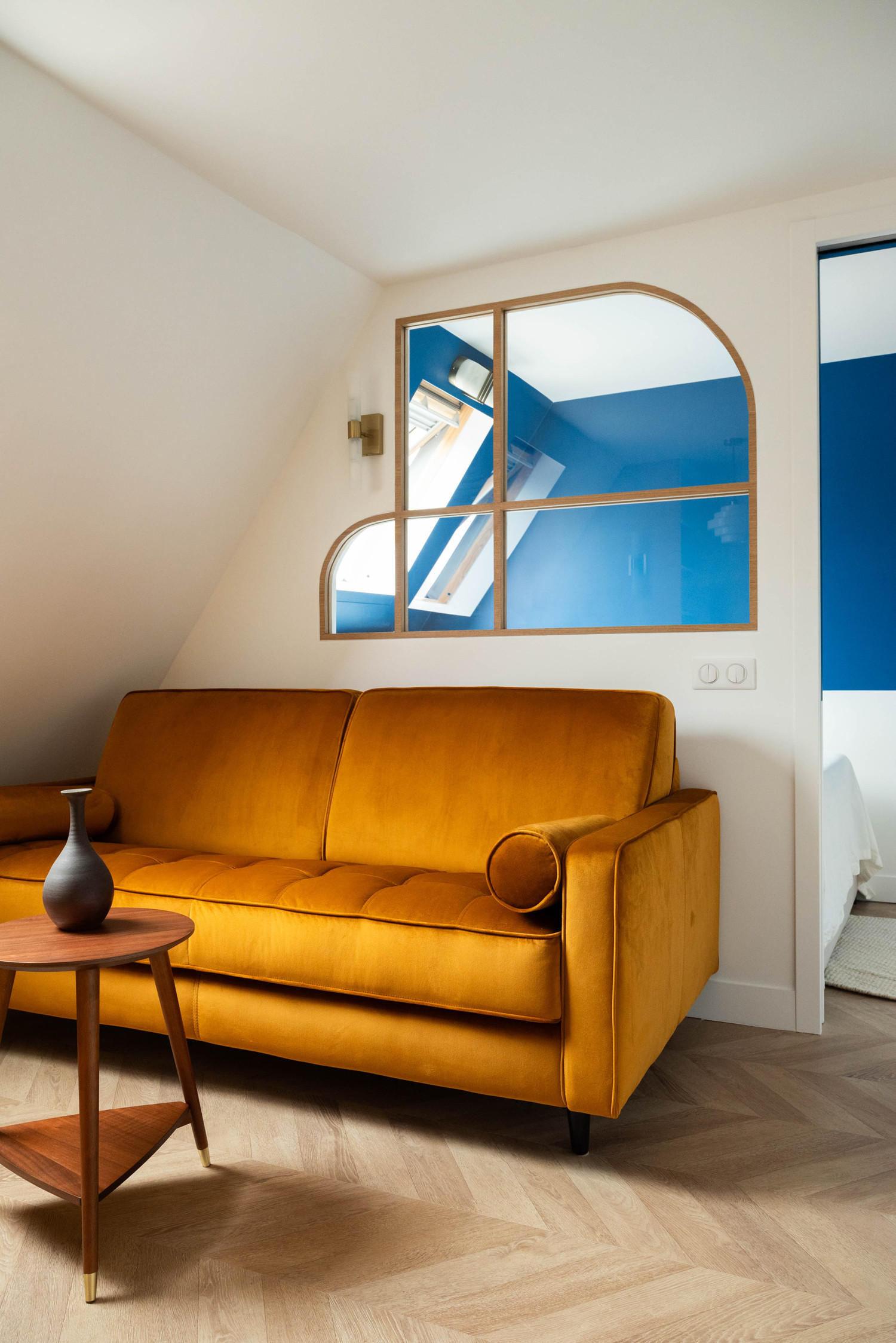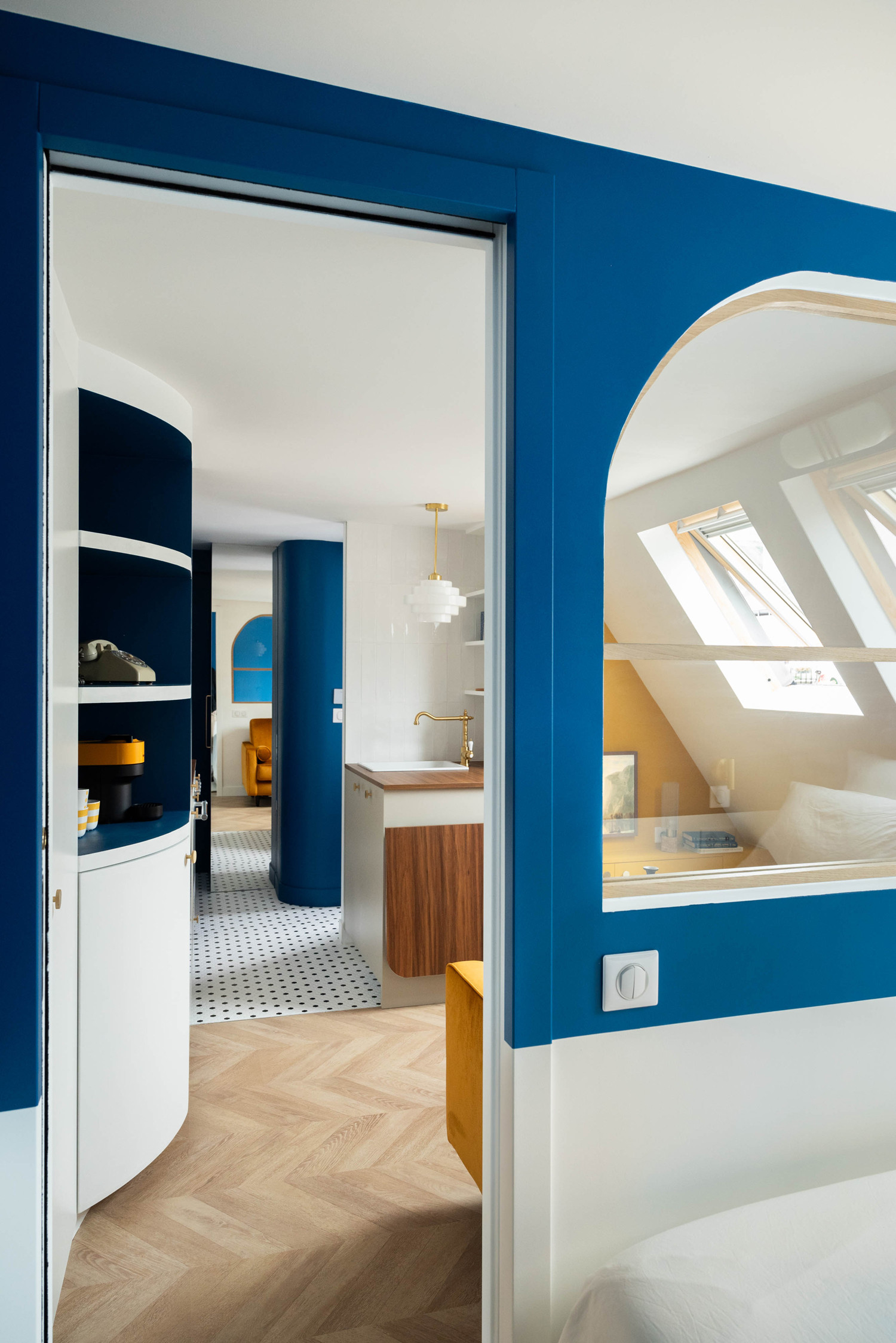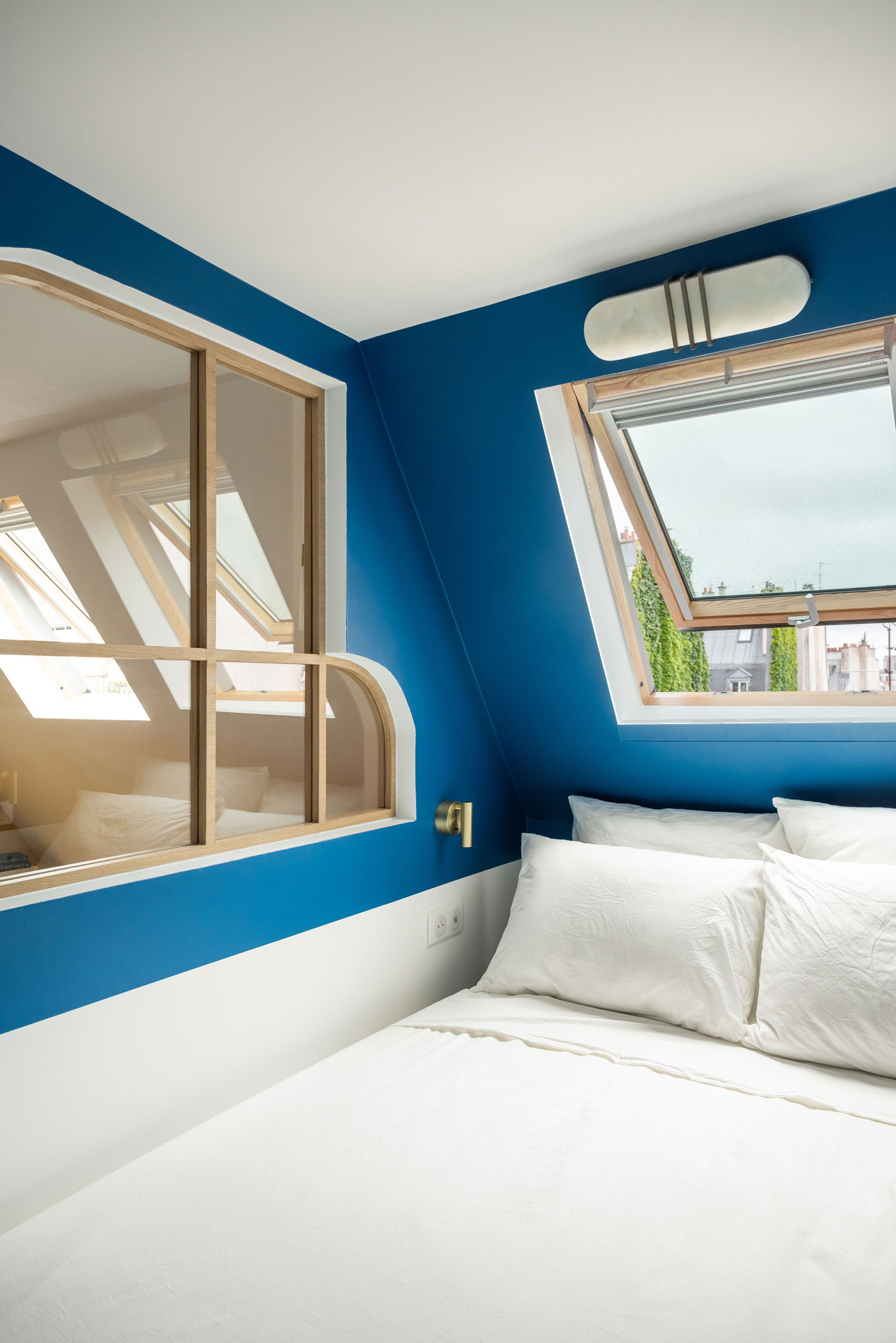 To mark out the flat’s relaxation zone, Alicia suggested contrasting the indigo blue with an invigorating sunny yellow that takes advantage of the abundant light from the roof windows.