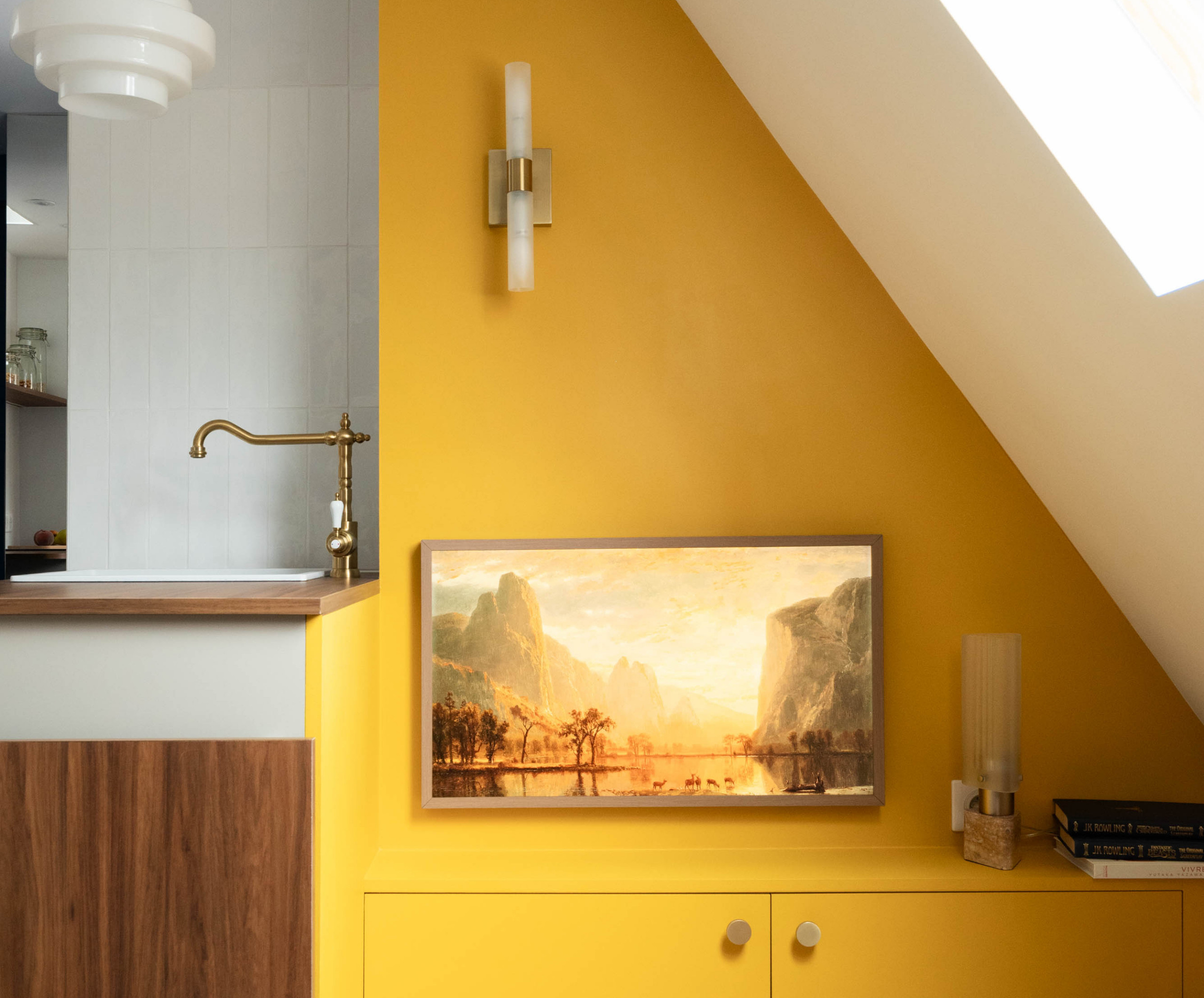 A Samsung Frame TV, which can show artworks when not in use, has been hung above a small closed storage area.