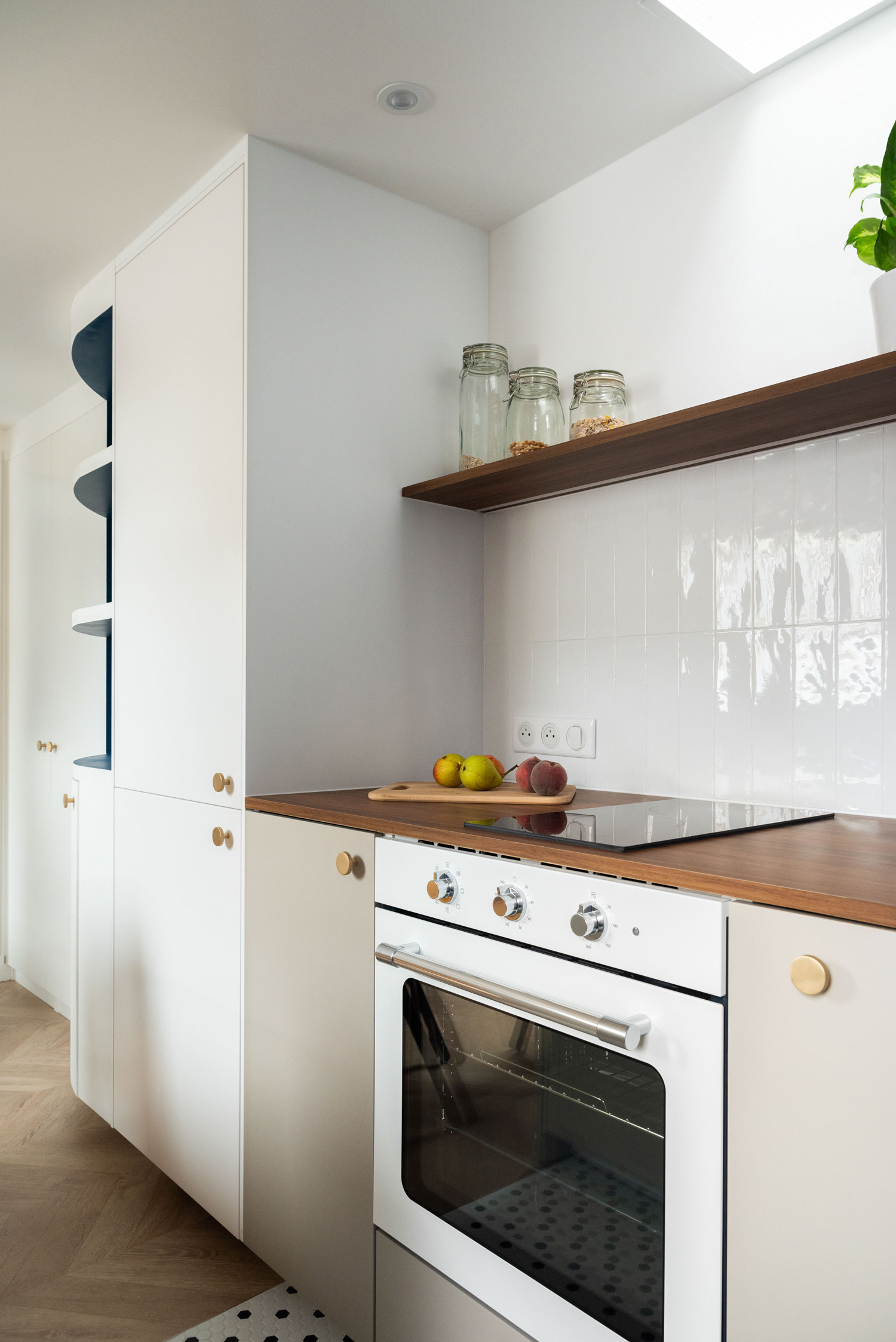 Given it’s right next to the living area, Alicia wanted to make the kitchen ‘disappear’ as much as possible and suggested pale cabinet colours “as if they were part of the walls”.