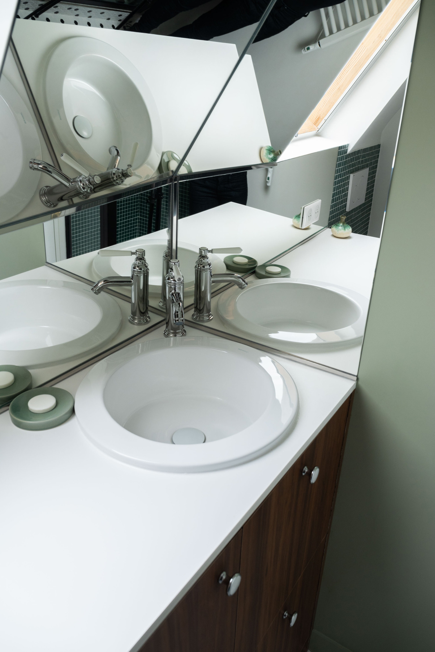 If the photo of the vanity unit is somewhat confusing, reflecting the entrance and the kitchen, it’s because Alicia had the sloping wall covered with mirrors framing the vanity unit. “It was difficult to put a mirror above the washbasin, which was set into the slope, so that’s where the idea came from,” she explains.