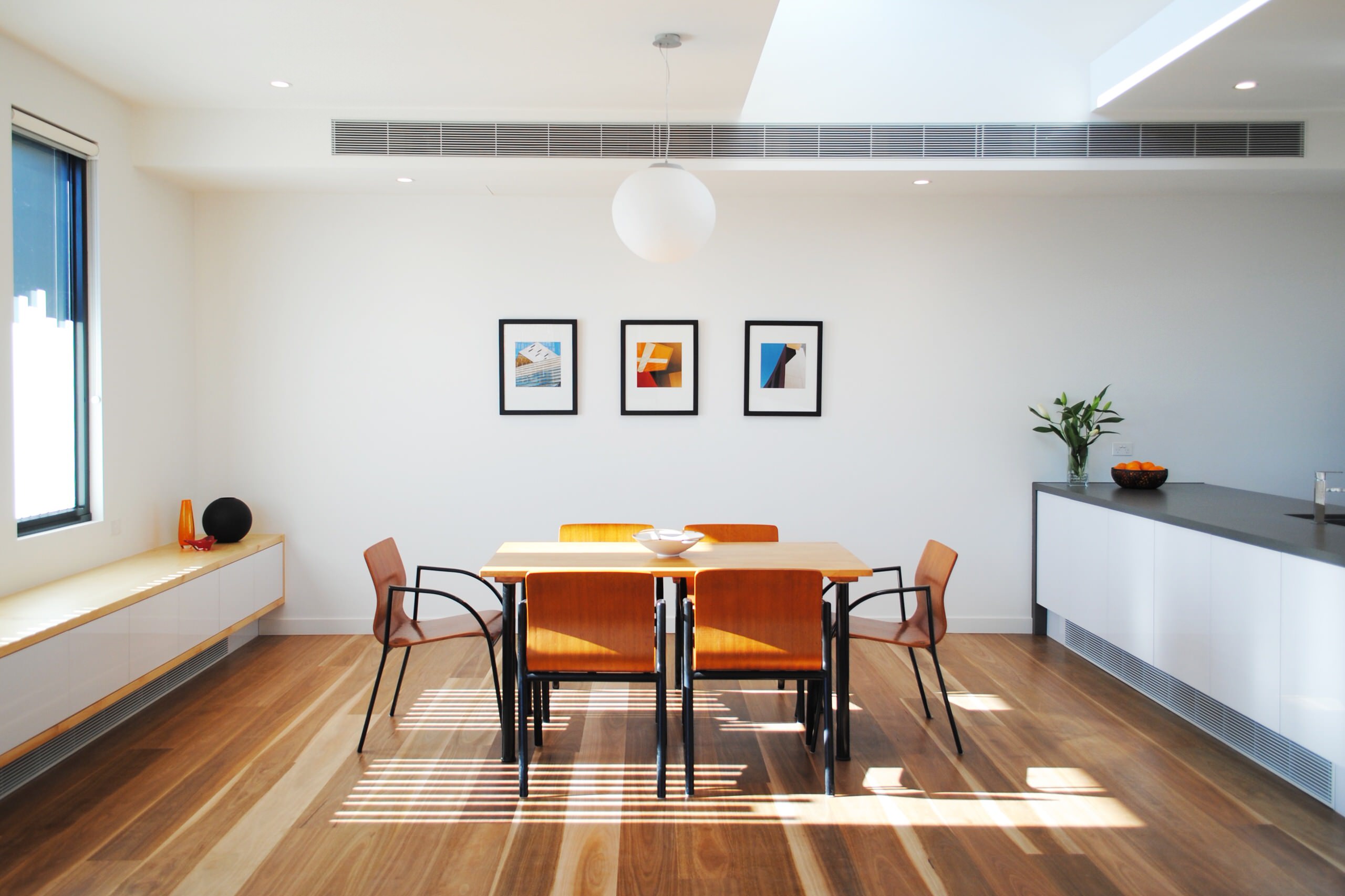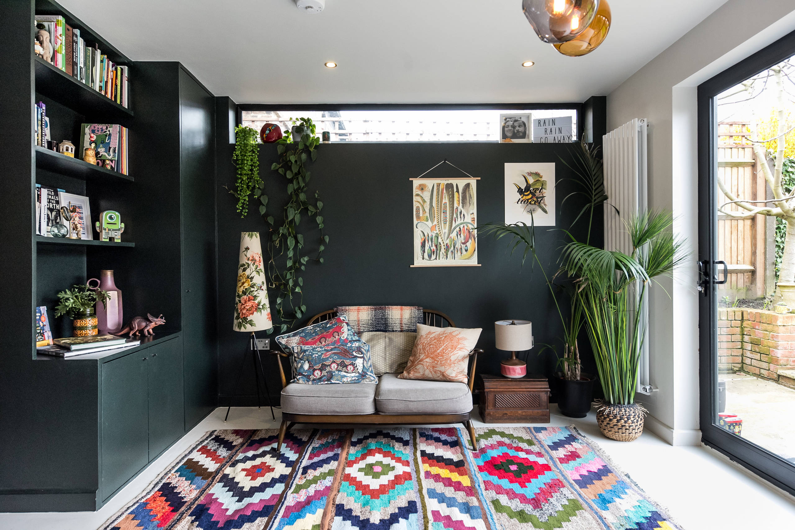 There’s a window seat that frames a view of the garden on the left, a big opening in the centre for views from the dining table, and a window in the kitchen area.