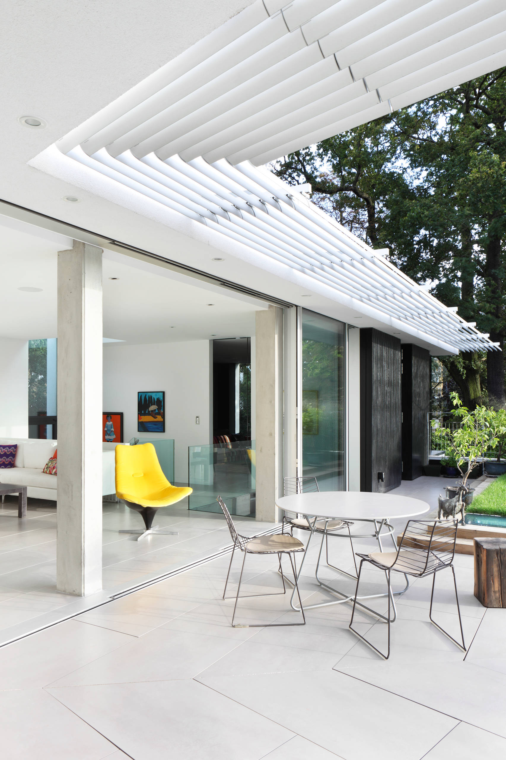 “Make them integral blinds,” Ruth says. “If you design in small recesses above the doors and windows for them to sit inside, the blinds won’t ruin the lines.” She recently completed a project where she added such recesses, but not blinds, giving the homeowners the opportunity to install them only if, after using the space for a while, they felt they really needed them.