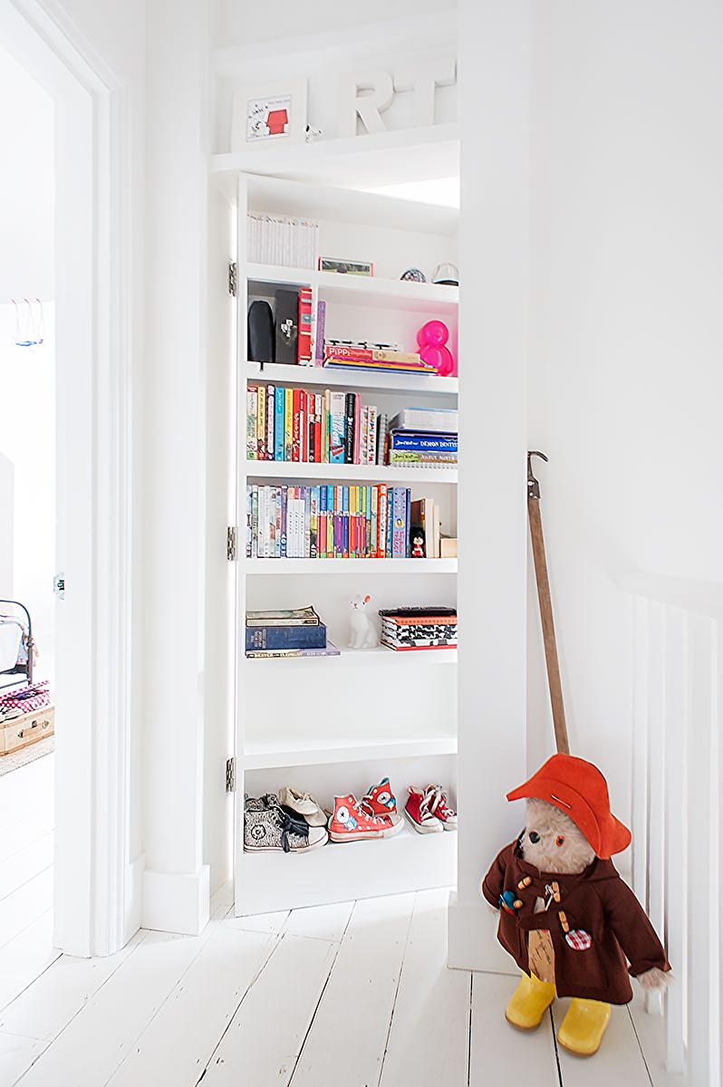 Doors can be a great place for storage, particularly if the items aren’t very deep. The small books and children’s toys here make a great display on the back of the door, and add some colour and fun to the space. To ensure items don’t slip off, fix a small lip to the front of each shelf.