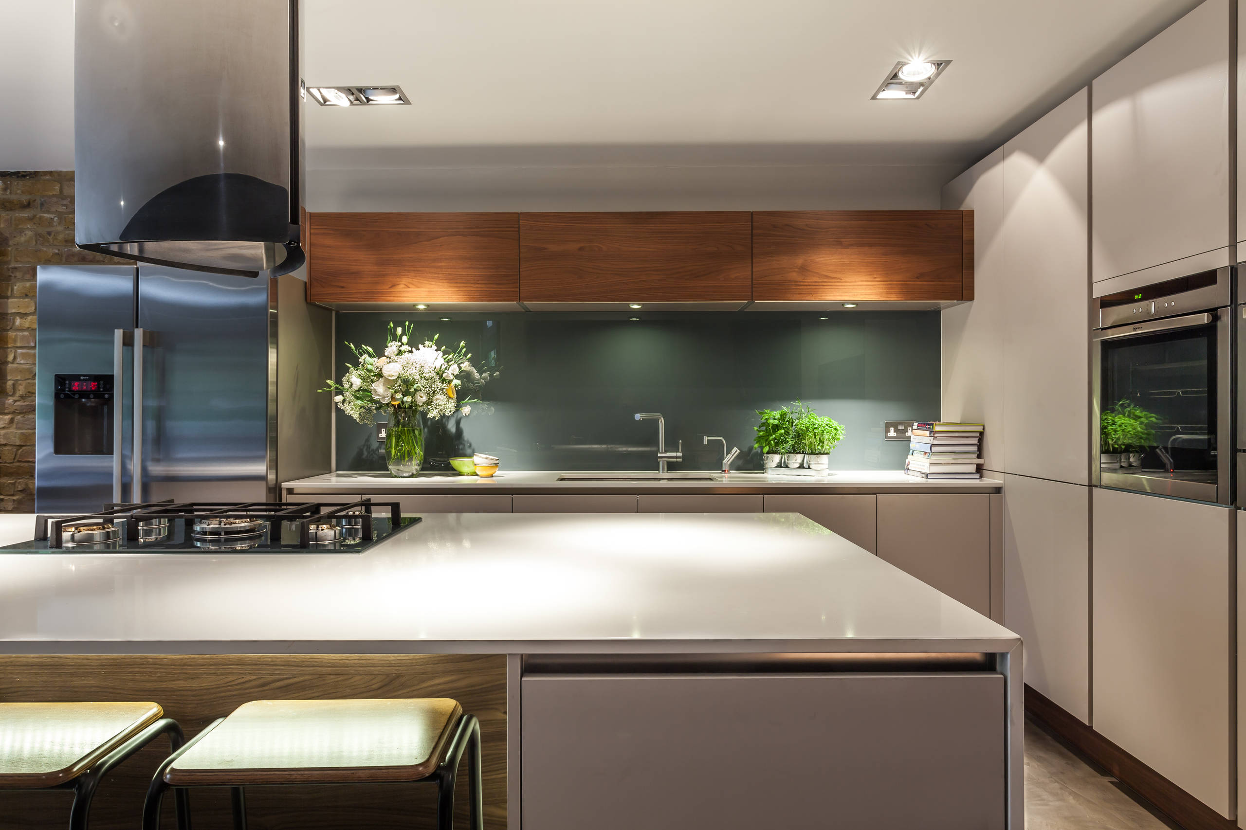 Composite (or solid surface) materials, such as Corian and Hi-Macs, are usually made from a blend of one-third resin and two-thirds natural mineral. Available in a diverse colour range, they also offer extraordinary design flexibility and can be seamlessly moulded into angles and curves, so there’s no join between your worktop and splashback. This makes them easy to keep clean and hygienic, because there are no joins where dirt can gather.