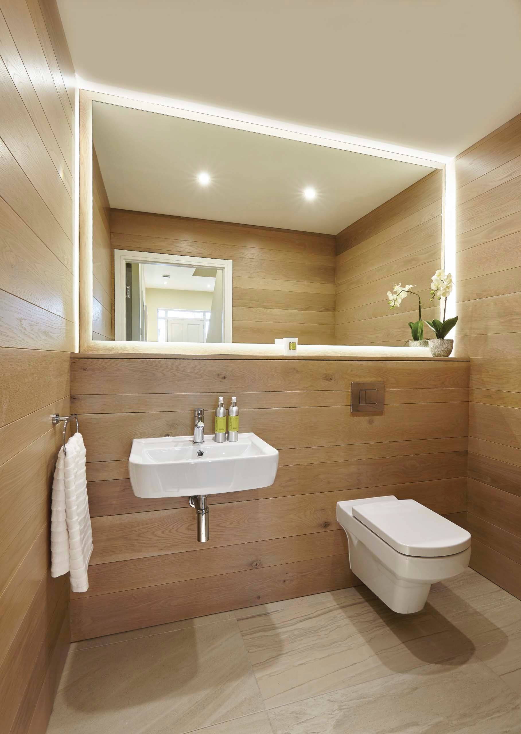 Look for novel ways to finish your room. Here, timber panelling makes a real feature out of an otherwise ordinary space, while concealed lighting behind the mirror adds another layer of luxury. The panelling is simply flooring that’s been fitted to the wall and sealed with a matt lacquer.