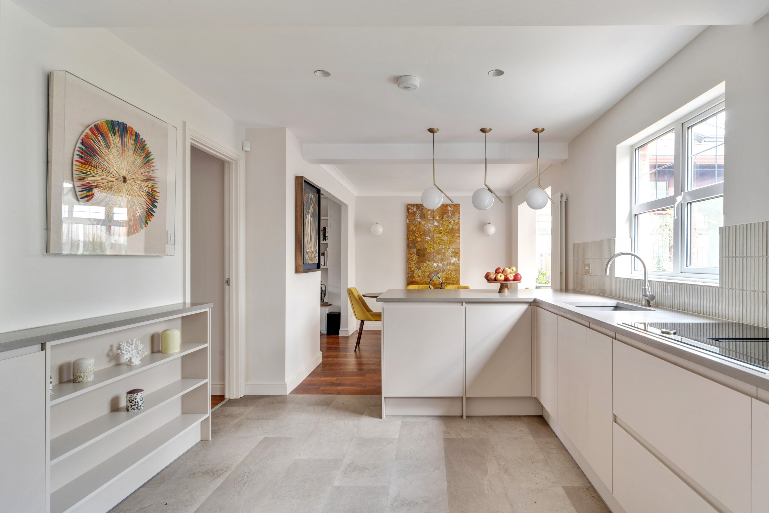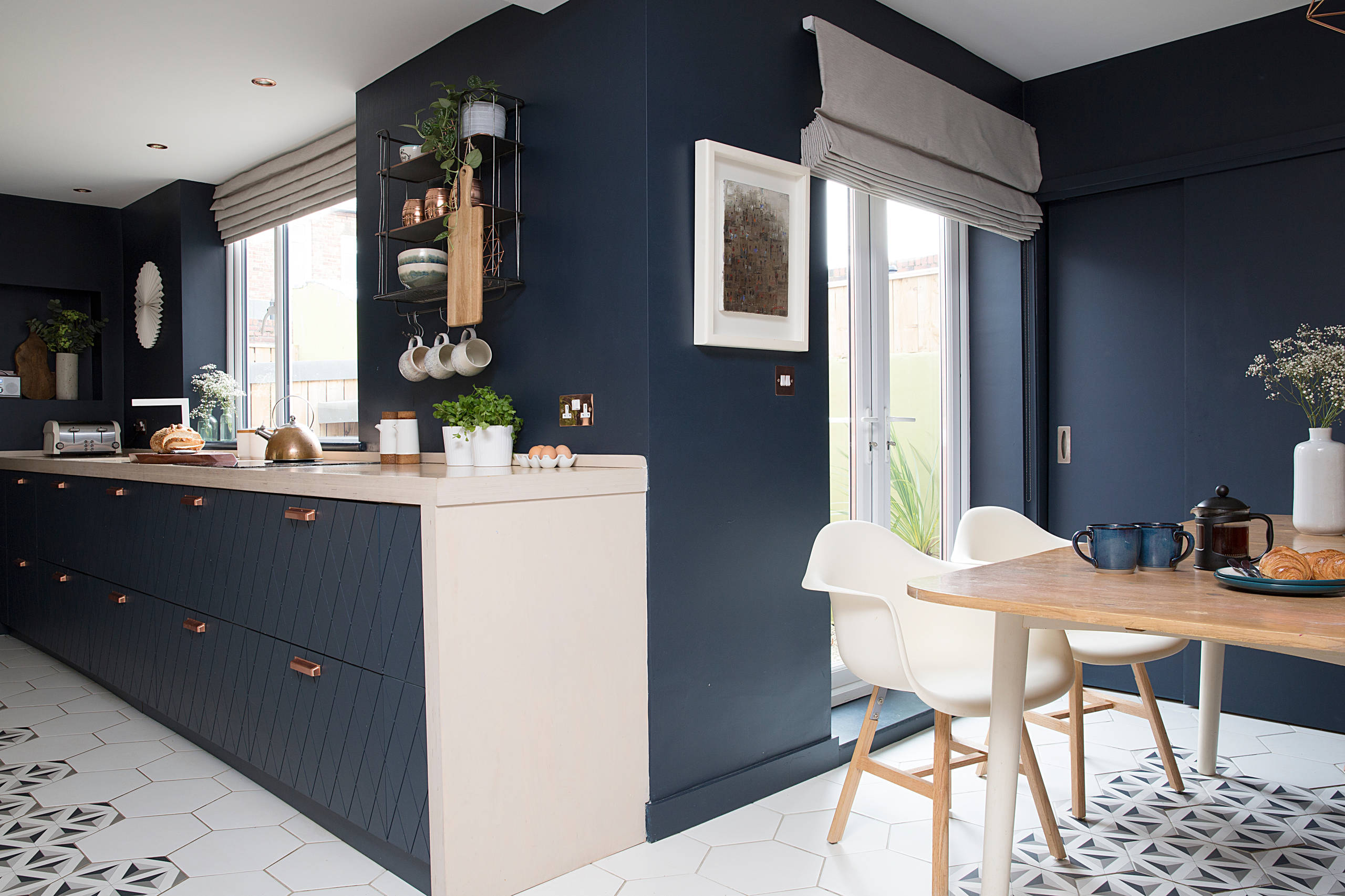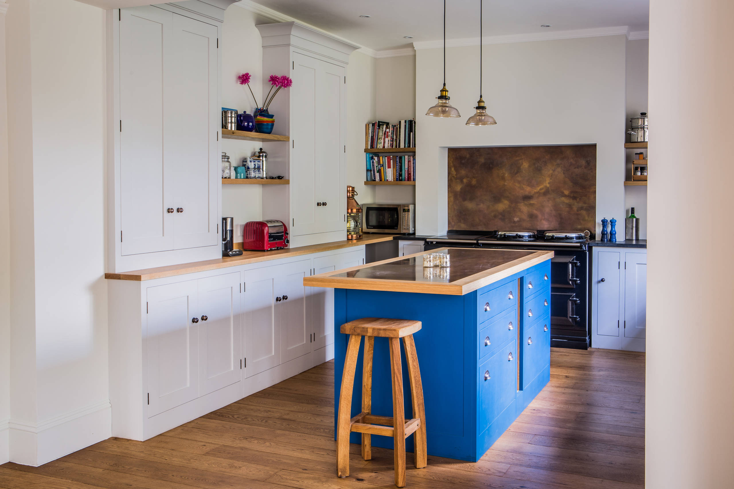 The owners of this cosy kitchen went for shallow shelves to keep the space airy. To make this work, the team at Honest Kitchens suggested ways to squeeze in storage elsewhere. A clever idea was to add a hidden cabinet beneath the breakfast bar.