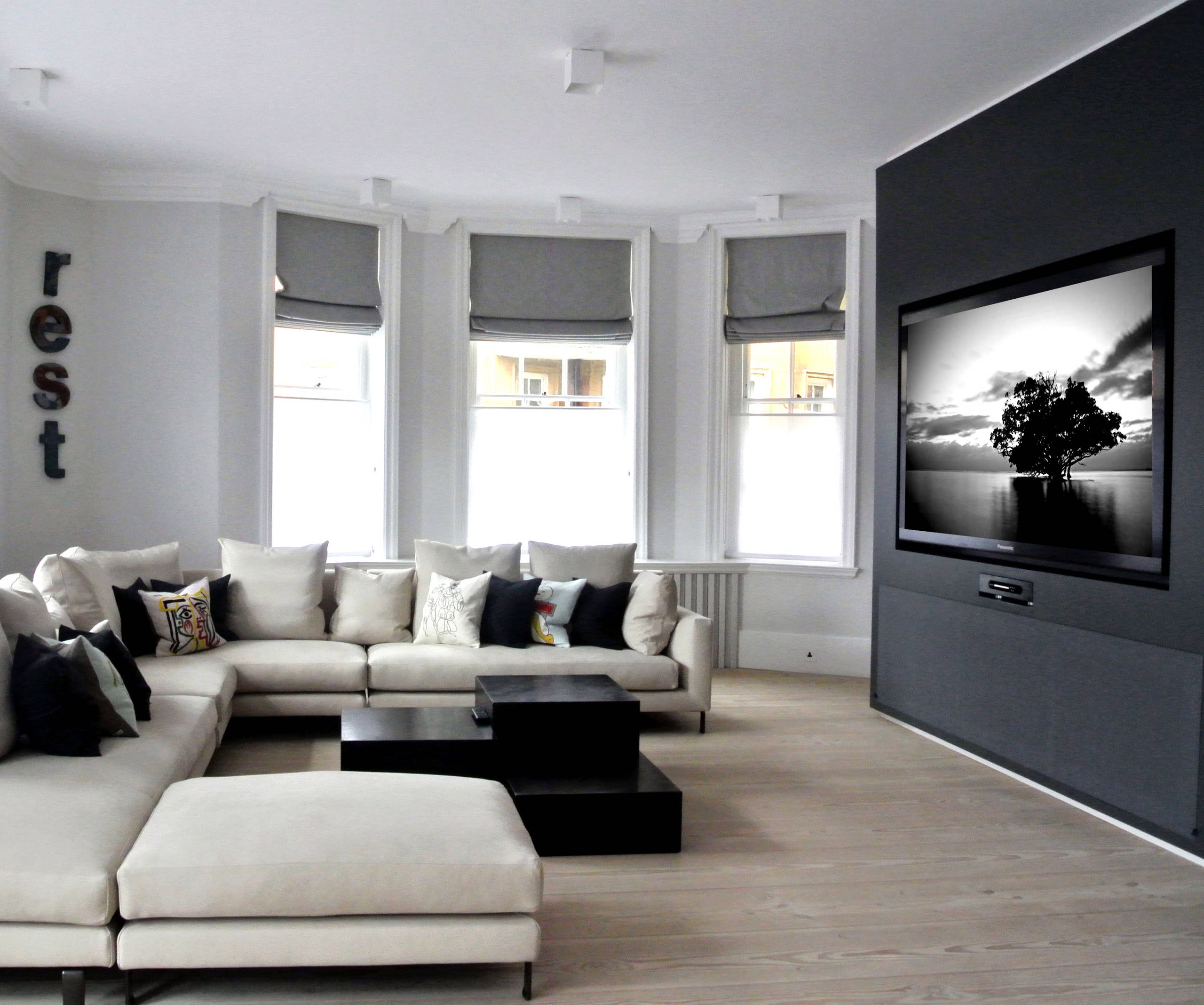 Consider having your screen mounted on the wall, instead of perched on top of a cabinet. This way, the screen is less obvious and the space can be used as you would a typical living room, with the option of enjoying a superior home cinema experience when you have a film to watch.