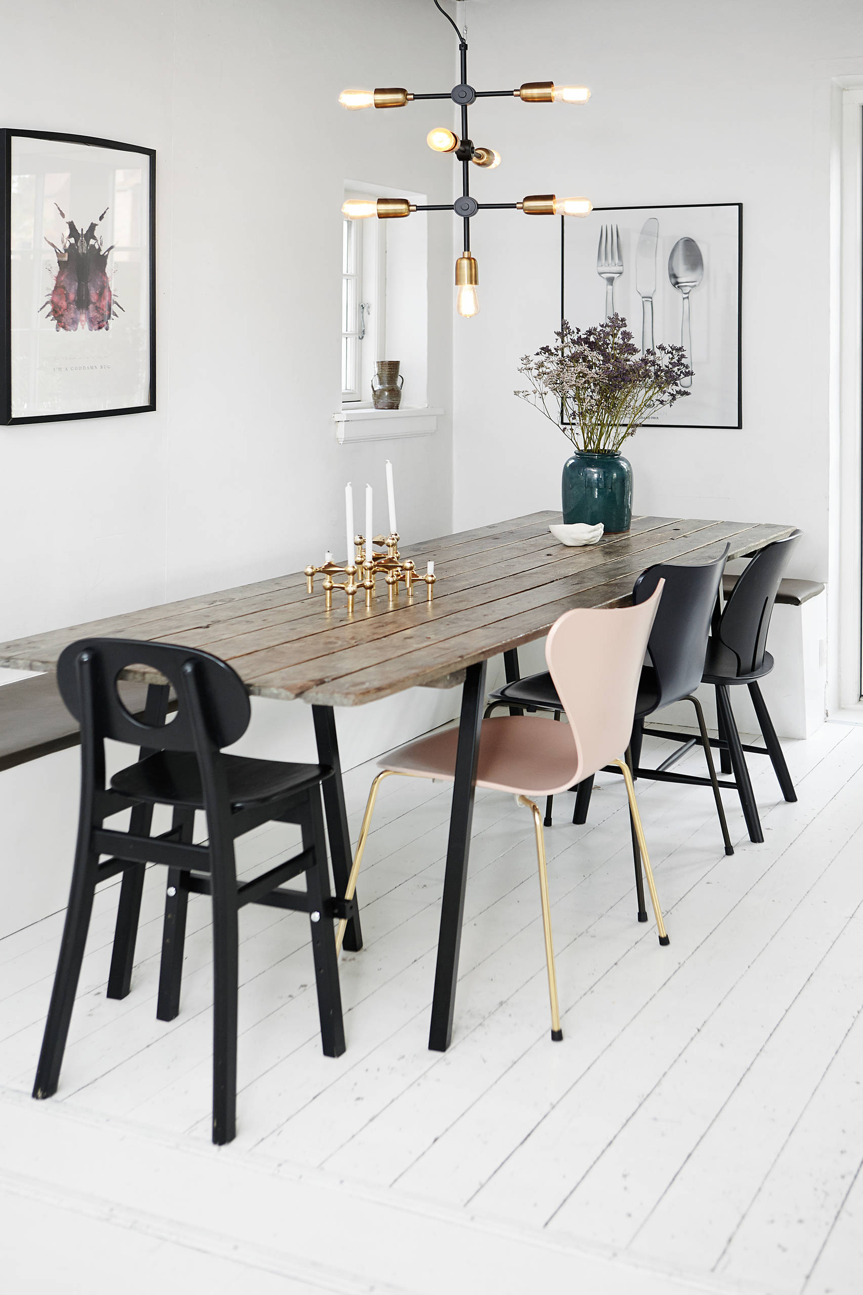 In this example, the cool, calm and Scandi aesthetic is only enhanced by mixed-up chairs, because of the focus on monochrome for the backdrop and choosing designs in the same or in a coordinating colour (that pink is picking up on hues in the left-hand artwork).