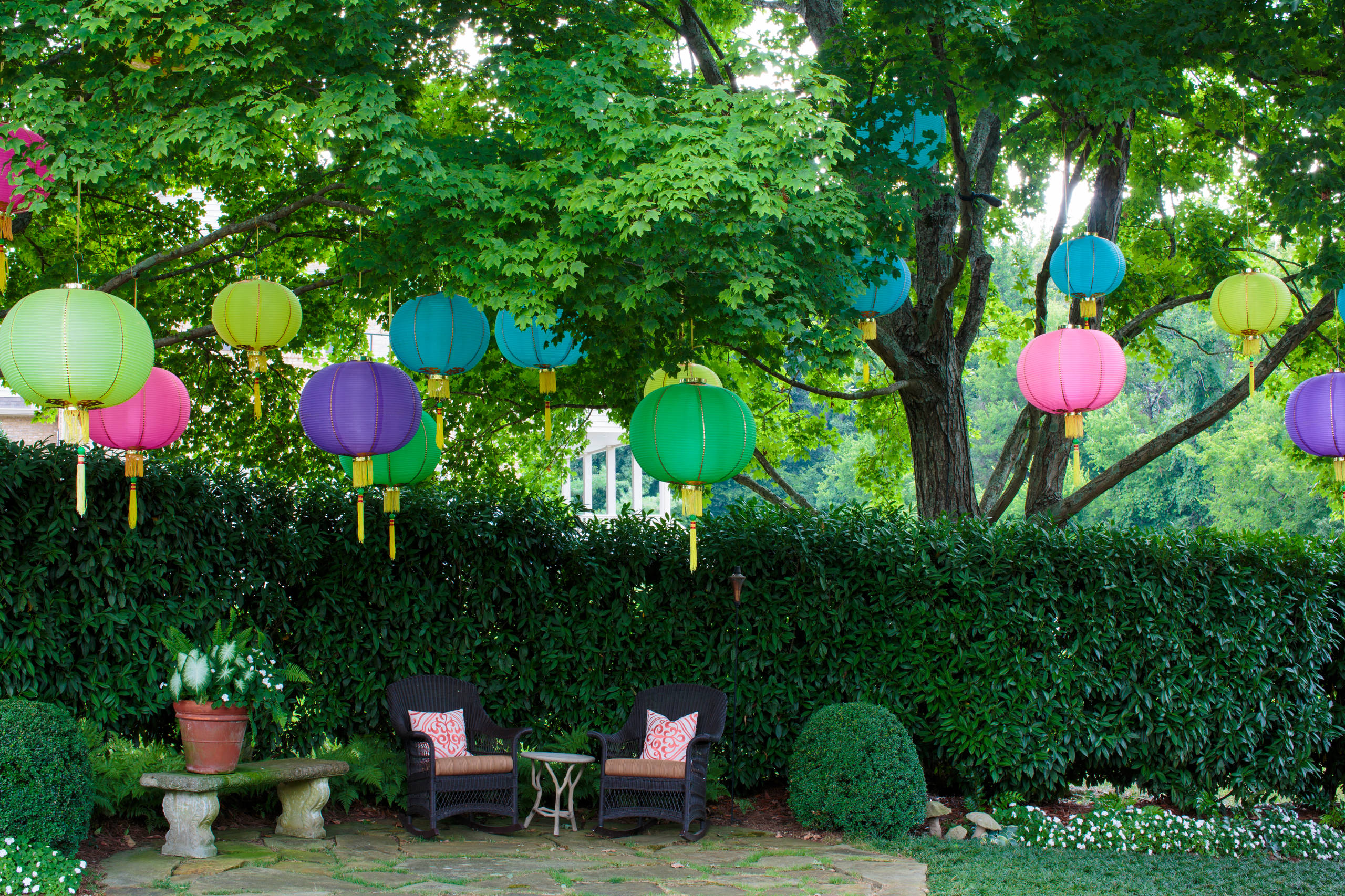 Hang decorations in the trees or bushes in your garden to give the party a carefree, festival feel. Oversized lanterns like these are extra impressive, or you could experiment with streamers or bunting for a low-fuss solution.