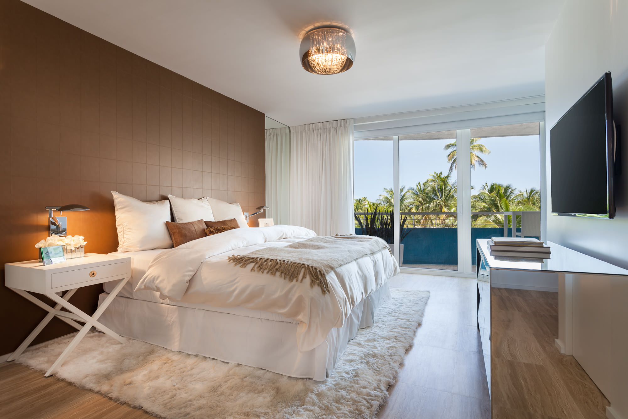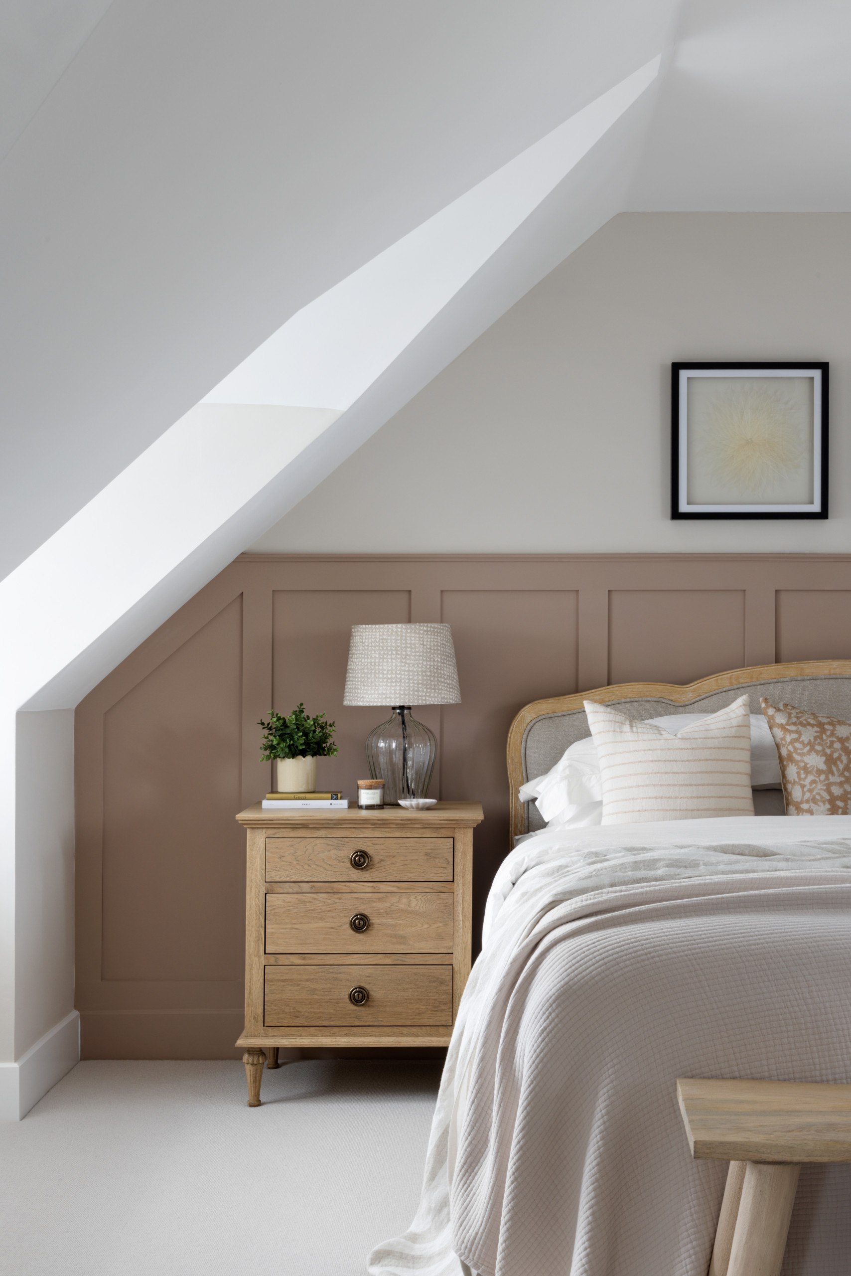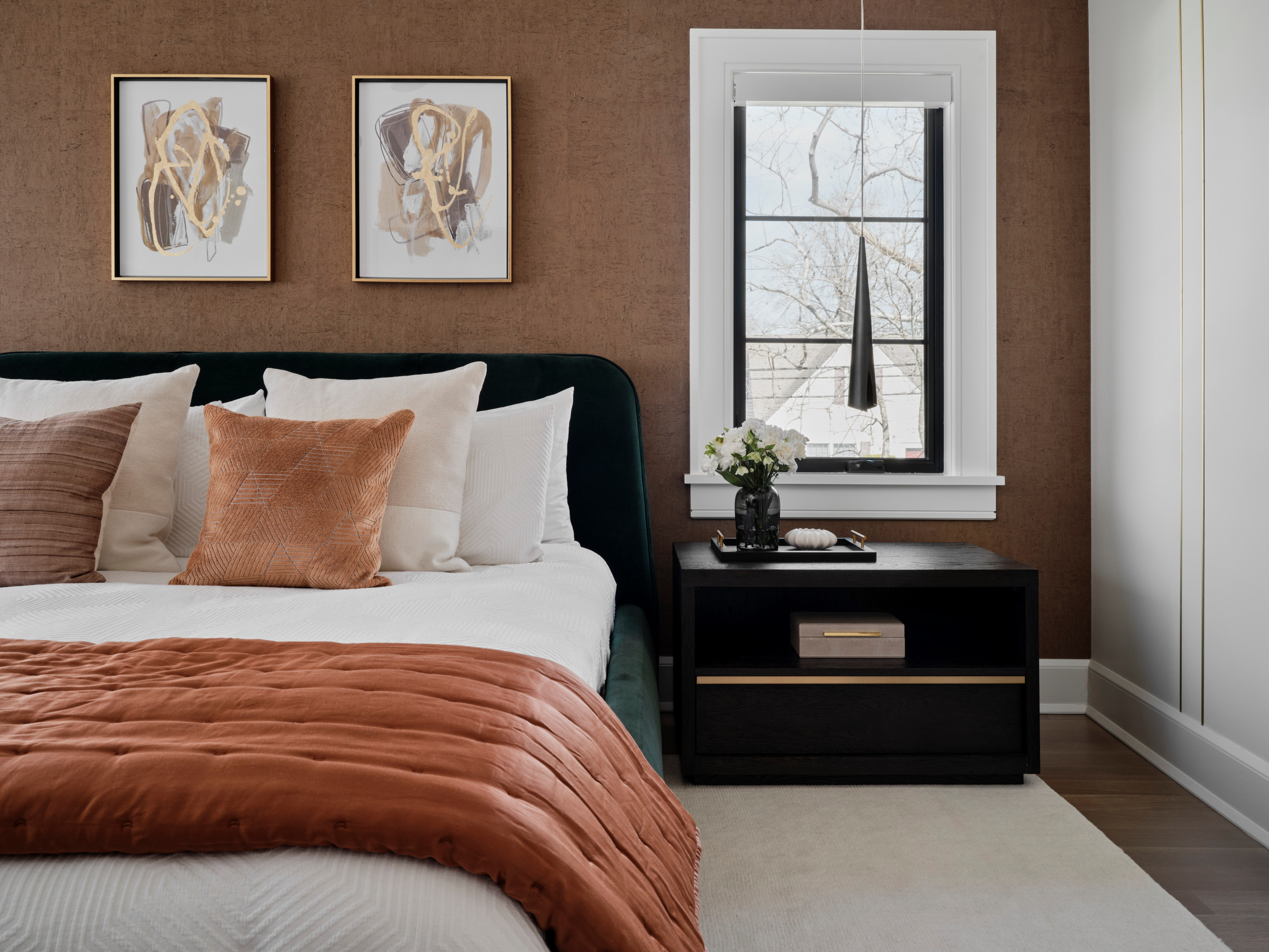 You could opt for an entire accent wall of a Mocha Mousse-like shade, as shown in the previous photo, or go for a more subtle use of the colour, such as a partial wall accent colour to ground the headboard.