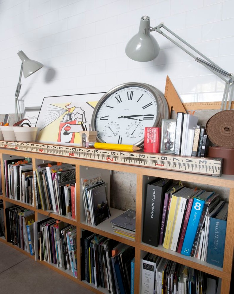 Gary and Elaine furnished the space with versatile freestanding furniture that they mounted on casters. A curved Arco lamp on a black marble base adds a touch of glamour, and arches over the couple’s ‘boardroom table’, a snazzy eBay find. The stainless steel table base and Tolix chairs complement the industrial vibe, while the oak table top injects some welcome warmth into the scheme.