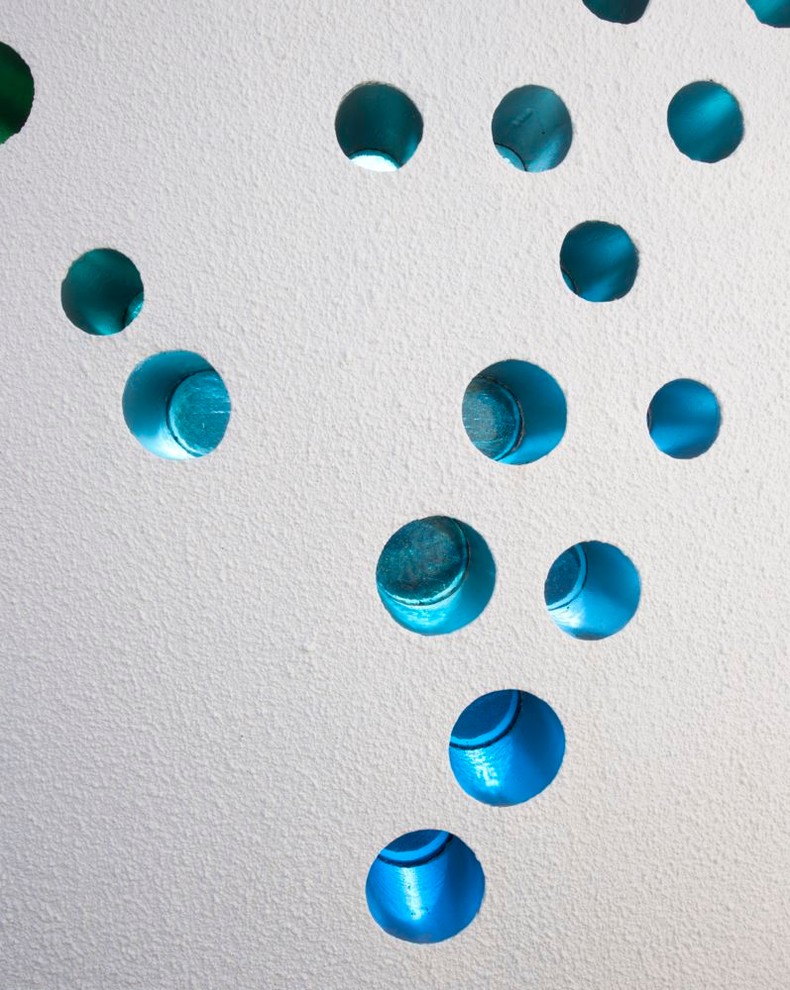 The white wall features cut-out circles filled with blue glass, adding a beautiful detail to the meeting area. ‘When clients and friends visit us, they’re always quite taken with the whole office,’ says Gary. ‘It’s such an interesting and unique space.’