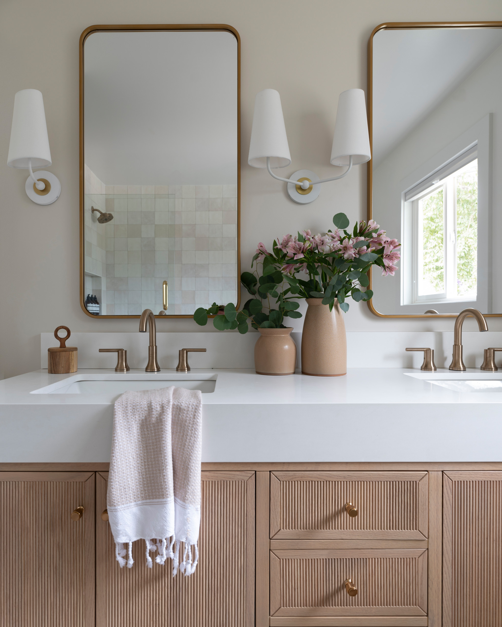 Natalia found a white oak vanity unit online that could be customised to have the reeded fronts her client requested. She topped it with white quartz with a thick edge for a modern look.