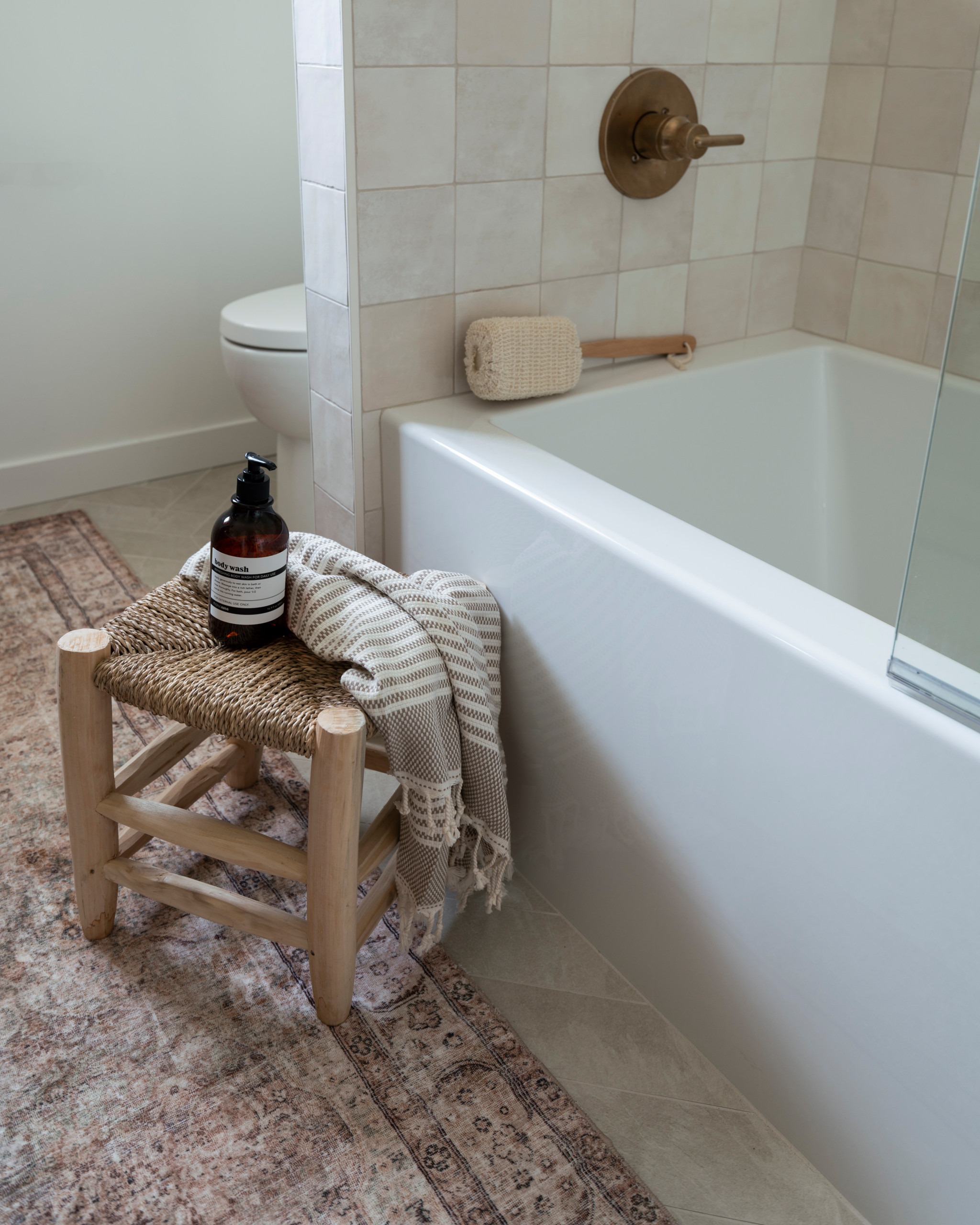A stool Natalia found at an antiques fair is a nice detail with multiple functions, including holding towels and offering a place to sit. Like the rest of the bathroom, it’s subtle but full of character.