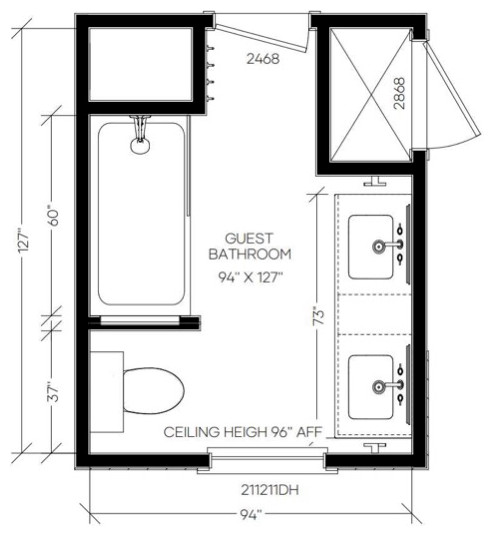The bathroom floor plan. Note the hooks for towels near the door; Natalia placed them at different heights for the children.