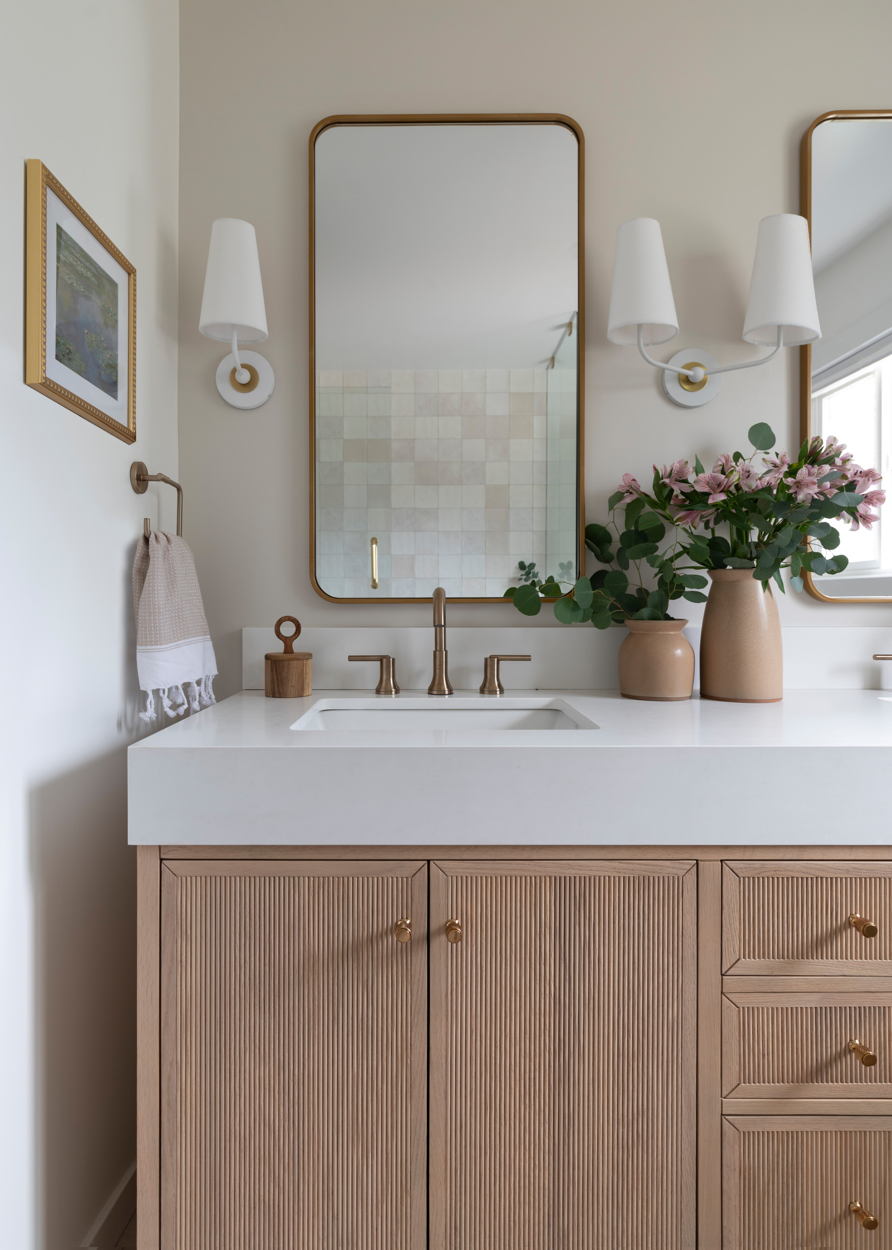Most of the walls are white, but if you look closely you can see that Natalia opted for a bit of contrast behind the vanity unit. The warm neutral paint with grey undertones blends with the rest of the room, but showcases the white vanity unit top.