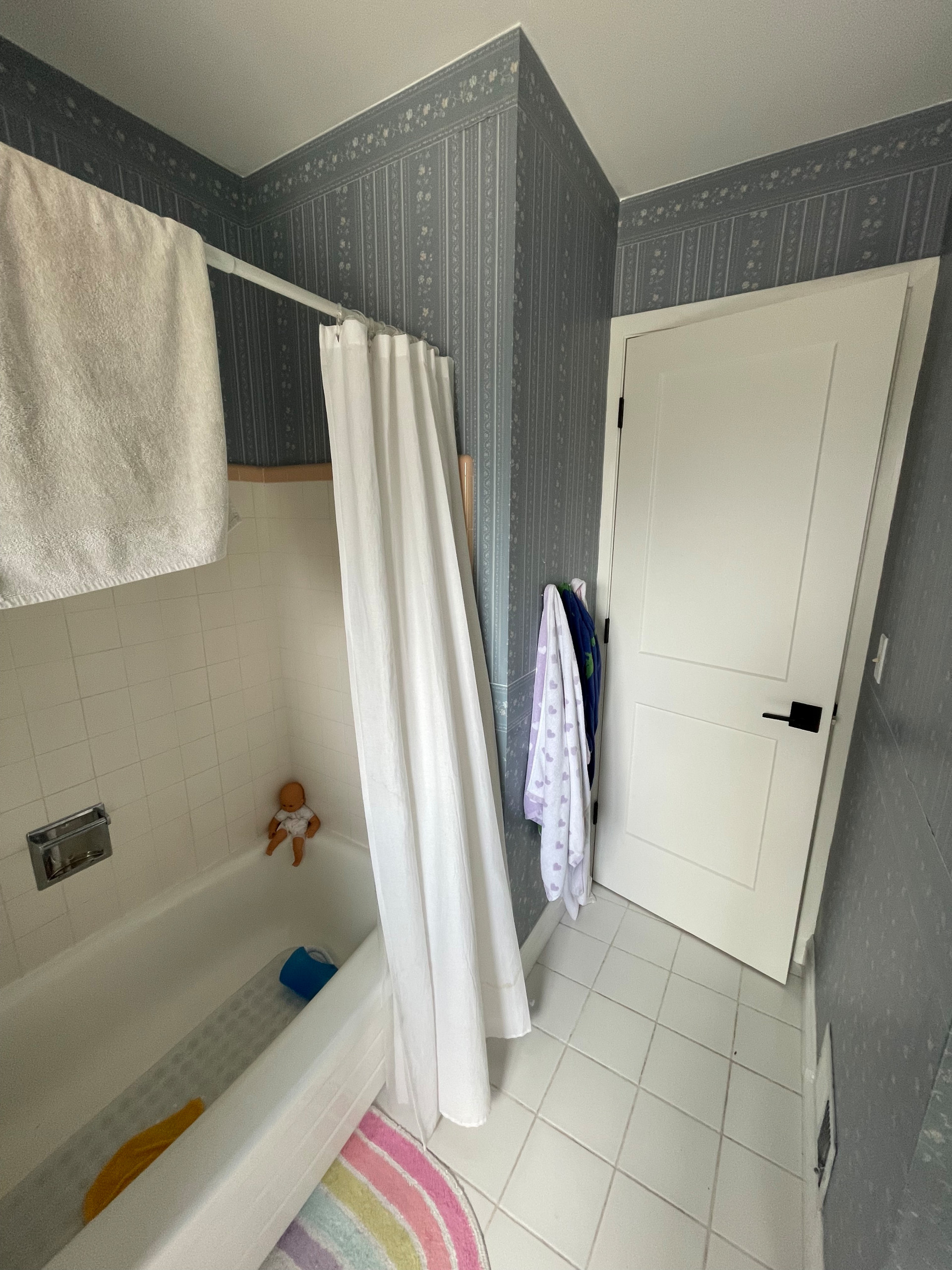 That arrangement worked well for the young family, but the finishes hadn’t been updated in some time. What’s more, the solid wall between the bath and toilet blocked much of the natural light coming in through the frosted window.