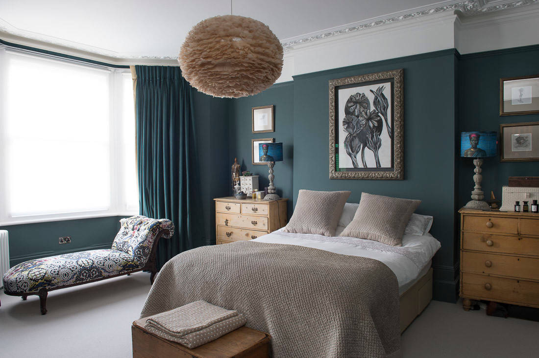 Teal combines green and blue, so will work with accents in either colour. In this bedroom by Nicola Hicks Designs, the bright blue flash in the bedside lamps appears to almost glow out of the dark walls.